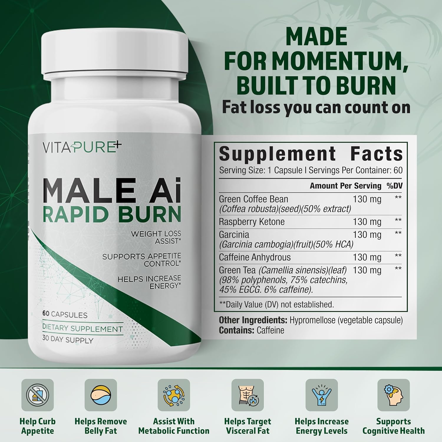 Male Ai Rapid Fat Burner for Men | Supports GLP-1 Pathway Function for Weight Loss | Appetite Suppressant, Energy Booster, Diet Pills | 3rd Party Tested Formula - 60 Capsules