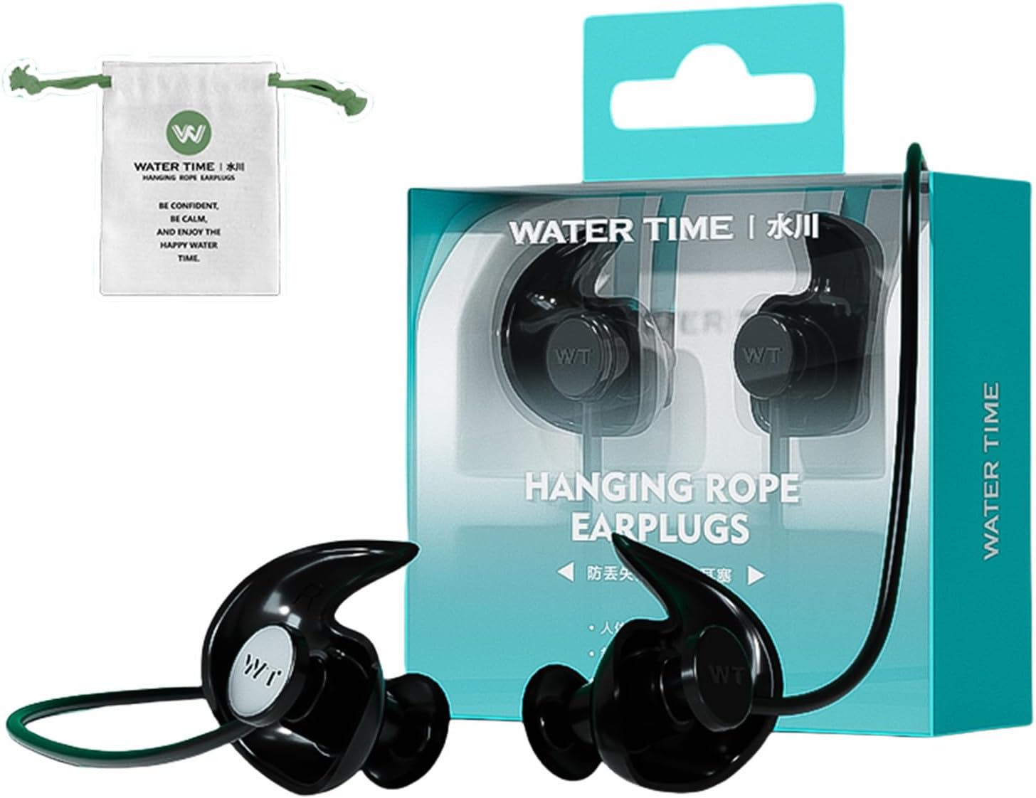 WATERTIME Waterproof Swimming Neckband Ear Plugs for Adults - Reusable Silicone Ear Plugs for Women & Men, Keep Ear Water Out for Swimming, Showering, Water Sports (Black, One Size)