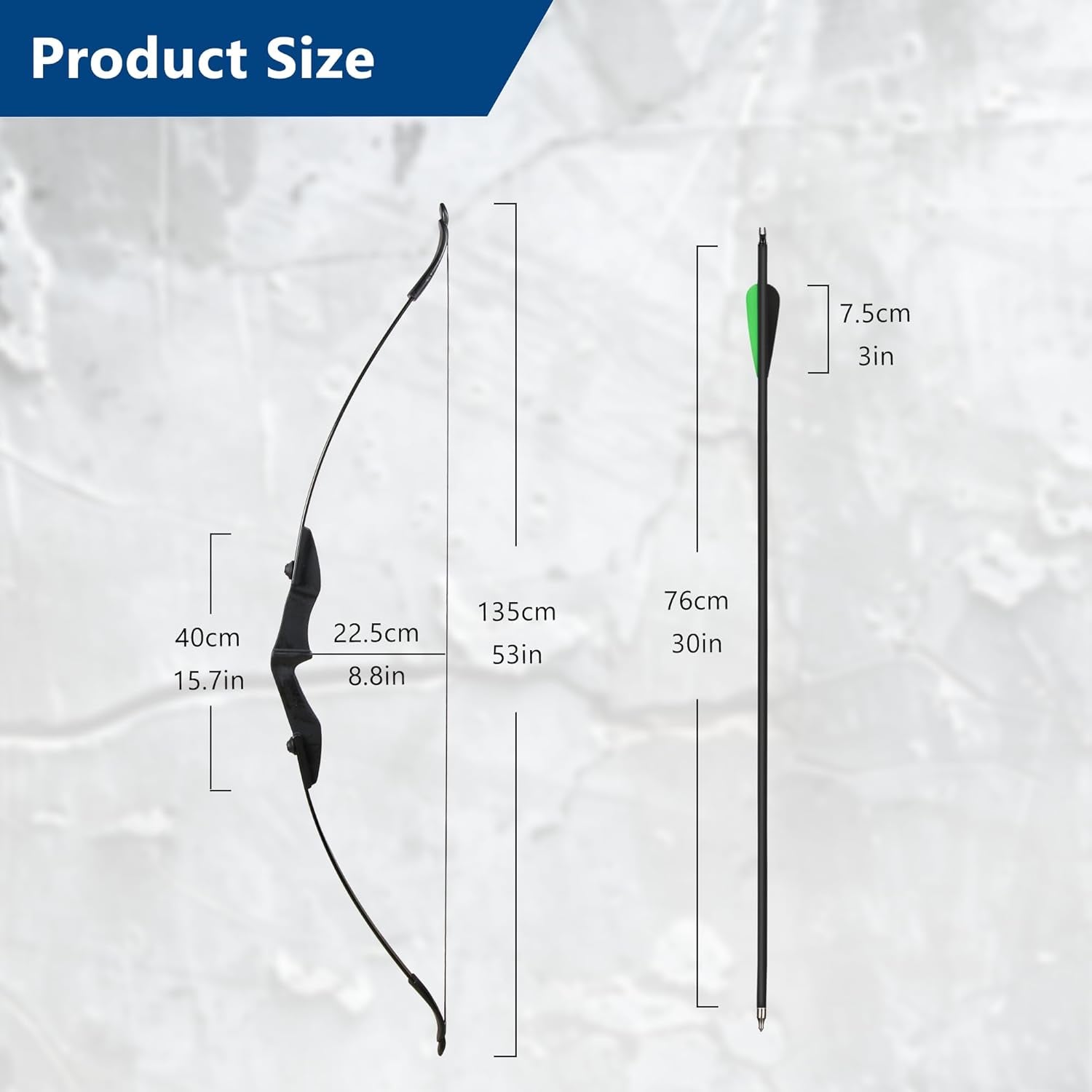 - Package contents:Takedown recurve bow *1, broadheads*3, hybrid carbon arrows*12, target paper*6, arrow finger guard*1, left and right arrow rests*1, Product Installation Instructions*1