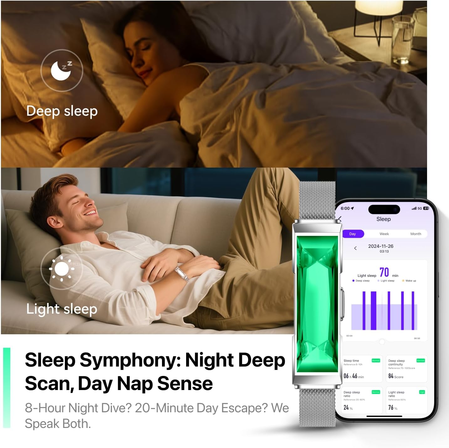 - 【All Day Sleep Tracker】The sleep tracker device Go beyond nighttime tracking. Monitor your daytime naps and get a complete picture of your 24-hour rest. Analyzes all sleep stages (REM, Light, Deep) and key metrics like duration and wake times. Gain clear insights into your sleep patterns directly on the companion app. Understand what helps or hurts your sleep so you can make changes and wake up feeling refreshed