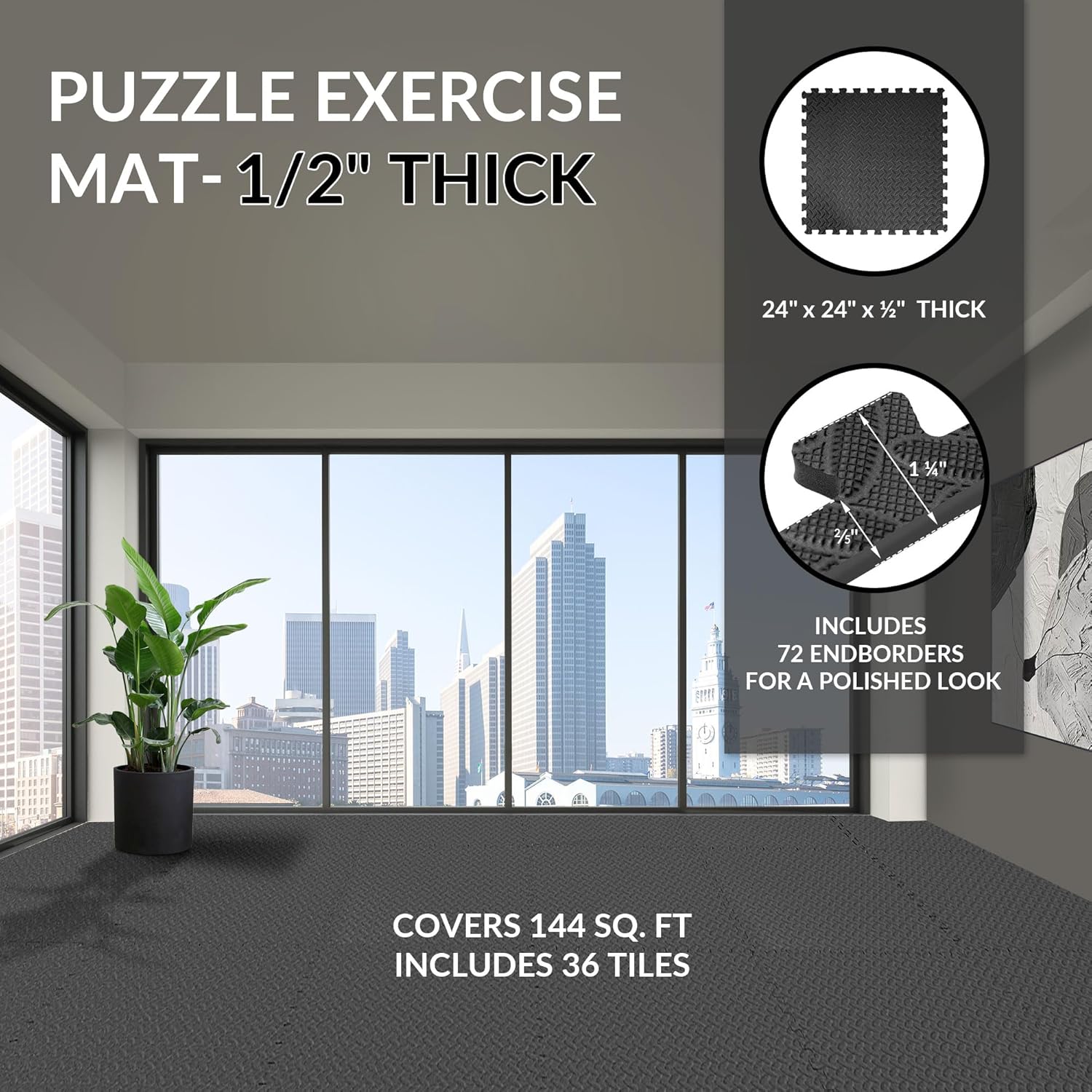 Puzzle Exercise Gym Flooring Mat, 1/2" Thick High-Density EVA Interlocking Tiles Workout Mat for Home Gym, Fitness Equipment, MMA, Gymnastics, 36-Piece Shock-Absorbing Exercise Mat (144 Sq Ft)