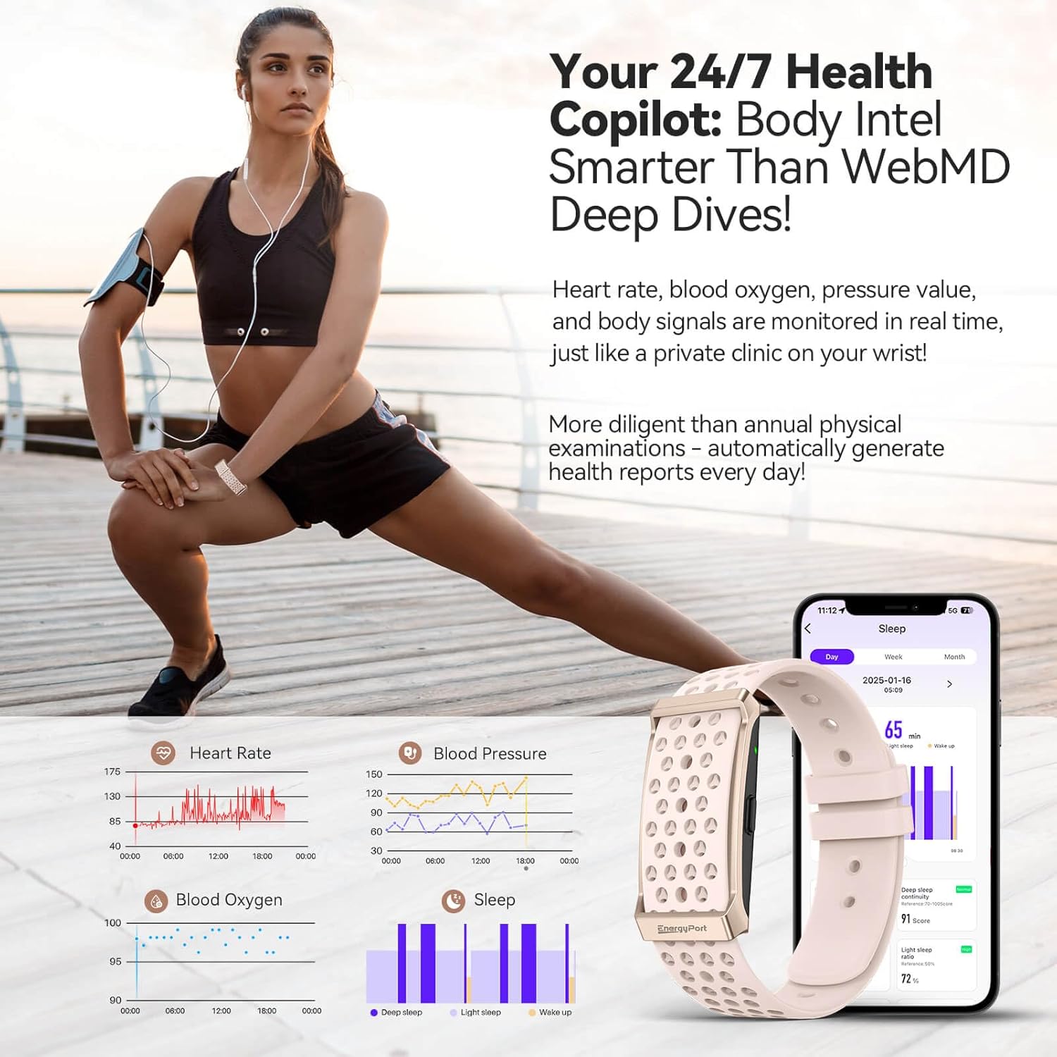 - 24/7 HEALTH GUARDIAN & WRIST CLINIC—Your wearable clinic: continuous heart rate, SpO2, blood pressure, and stress monitoring. Daily health reports. Smart alerts: abnormal heart rate during activities, altitude SpO2 tracking, blood pressure trends. AI period prediction with exercise adjustments. Plus: stress scans, NASA-inspired Power Nap, guided breathing, fatigue analysis.