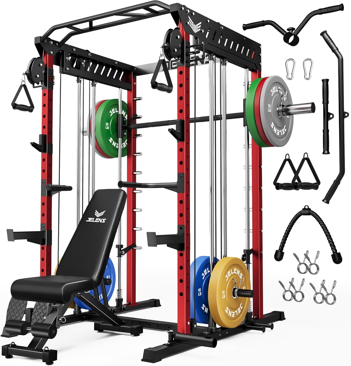 - 【Build Your Dream Home Gym】JELENS M21 smith machine has independent pulley systems on both sides, allowing you to exercise with family and friends at the same time. In addition, the power cage supports simultaneous exercises such as squats before and after. The non interfering dual pulley system and front and rear partitions provide greater exercise versatility, while also enhancing the fun and experience of home gyms.
