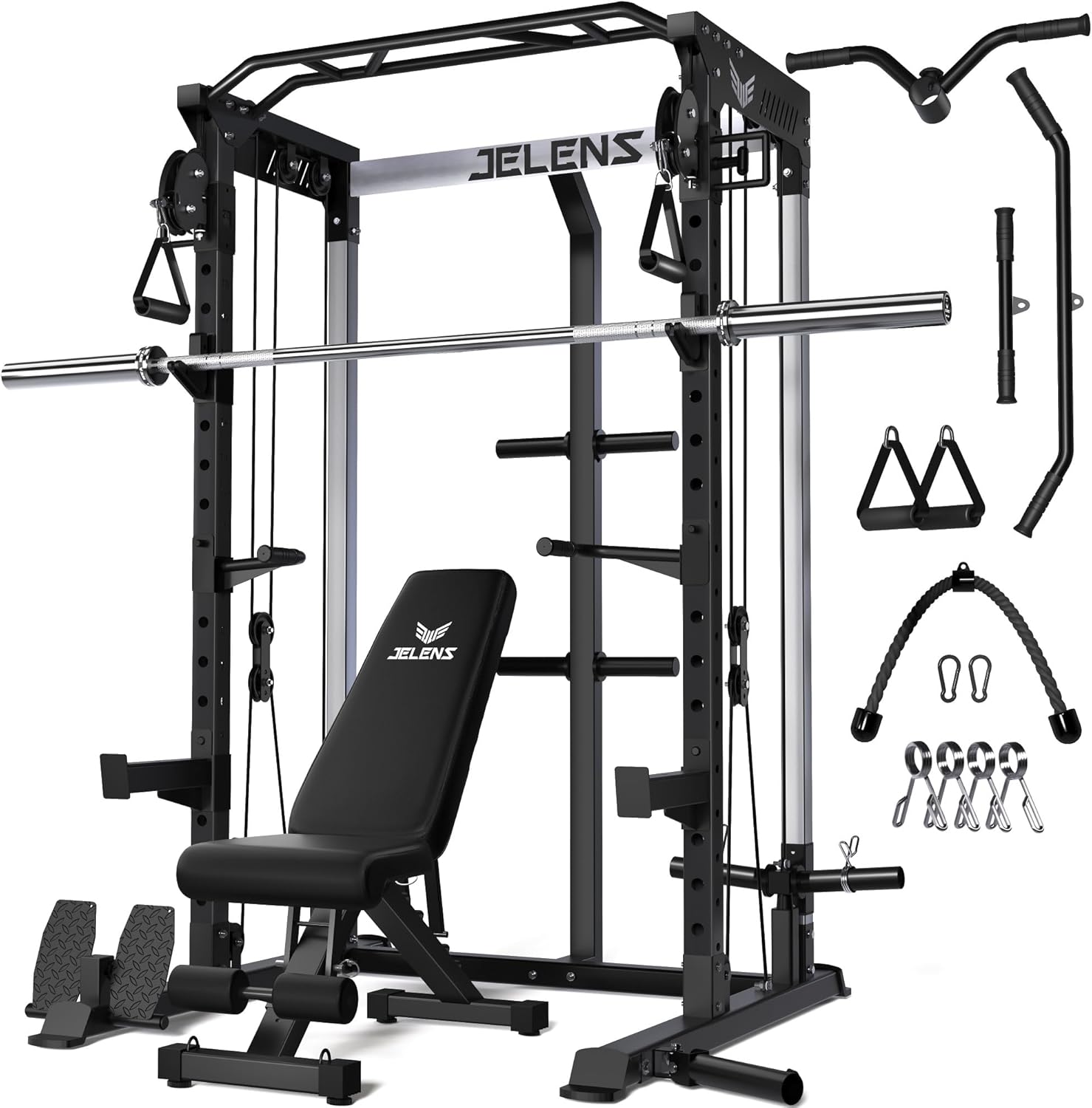 - 【All in One Home Gym Partner】Maximize the use of JELENS squat rack to create your home gym - one machine can meet your diverse needs.Whether you are novices or athletes, JELNES provides everything you need for full body exercise such as bench presses, squats, 360 ° mines, seated rowing, pull ups, triceps extensions and more, allowing you to do unlimited exercise in a limited space, taking muscle training to a new level!