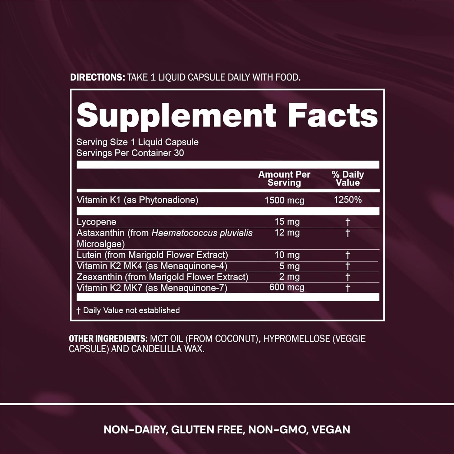 - Comprehensive Antioxidant Support – Features Lutein, Zeaxanthin, Lycopene, Vitamin K1, MK-7, and MK-4 to support vision, bone strength, and overall health in one convenient capsule.*