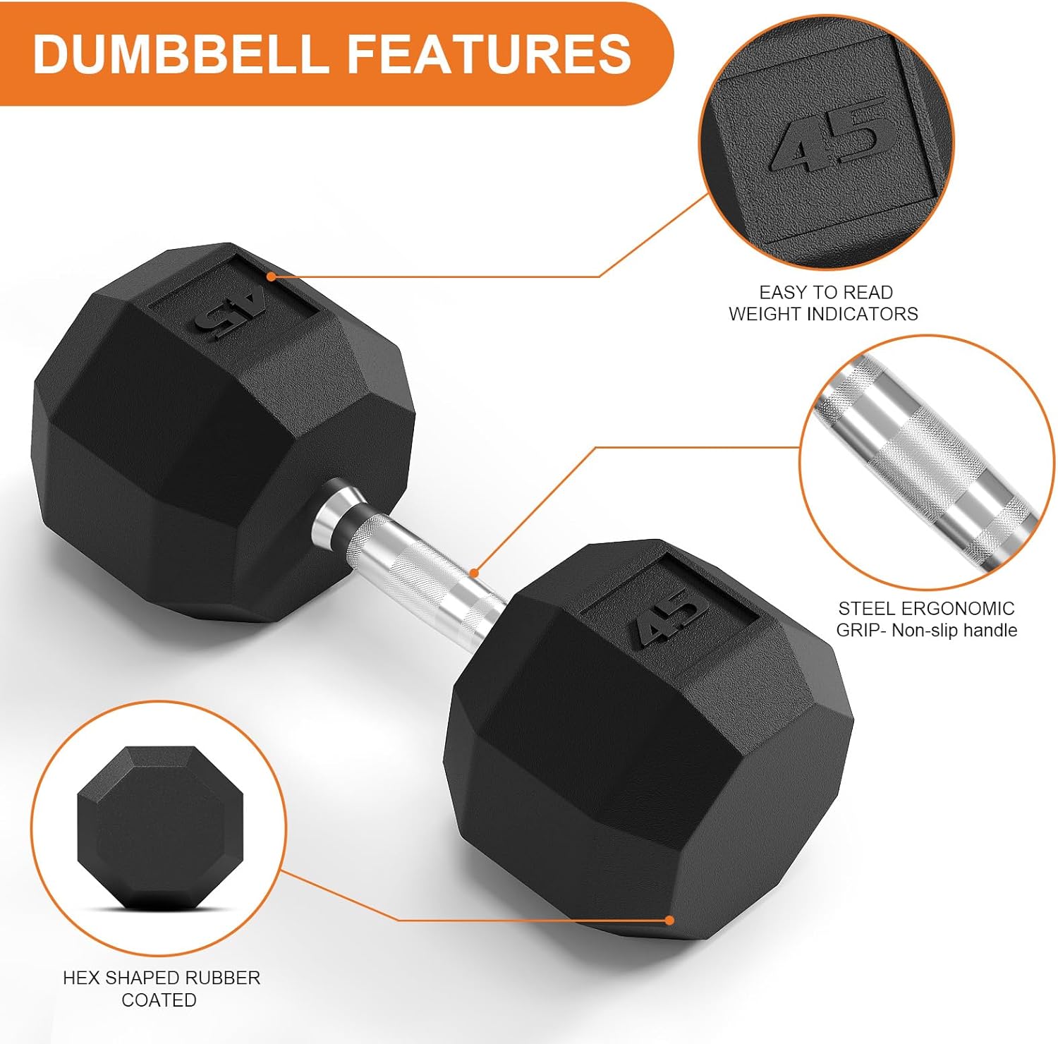 - Complete 45LB Hex Dumbbell Set: This hex dumbbell set includes two 45LB weights, making it the perfect hand weight choice for both men and women who want to take their strength training to the next level at home or in the gym