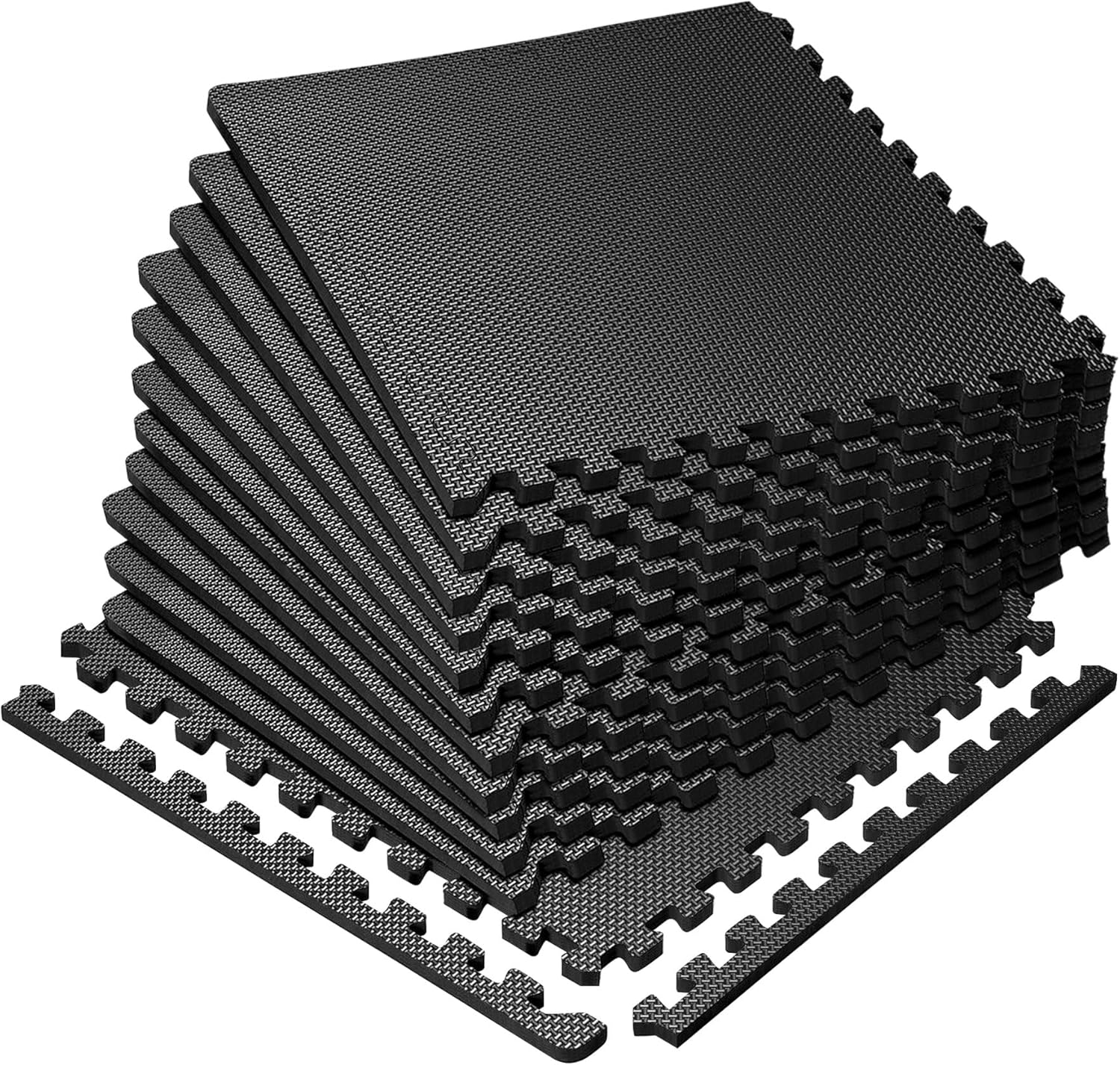 - Versatile Exercise Mats: This set includes 12 black puzzle mats, each measuring 24in Ă— 24in Ă— 0.5in, covering a total area of 48 square feet. The floor mats have interlocking edges, allowing you to easily move or expand them as needed. Each mat comes with 2 removable borders for a cleaner, more finished look. Plus, the compact design makes it easy to store in small spaces