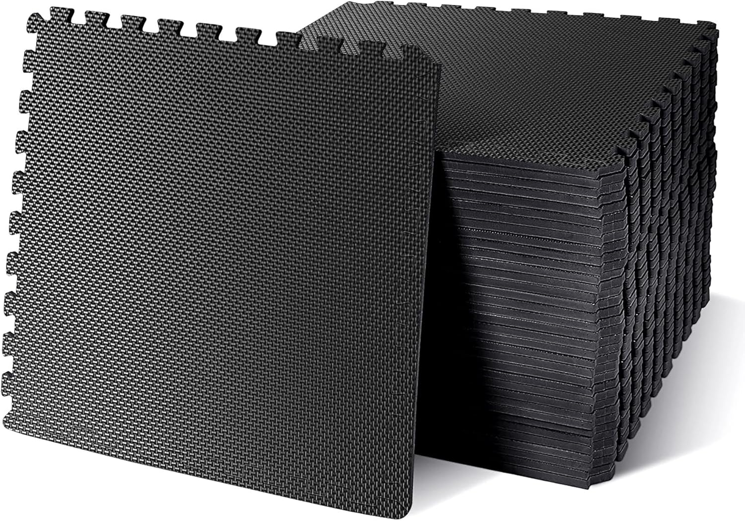 - Versatile Exercise Mats: This set includes 36 black puzzle mats, each measuring 24in Ă— 24in Ă— 0.5in, covering a total area of 144 square feet. The floor mats have interlocking edges, allowing you to easily move or expand them as needed. Each mat comes with 2 removable borders for a cleaner, more finished look. Plus, the compact design makes it easy to store in small spaces