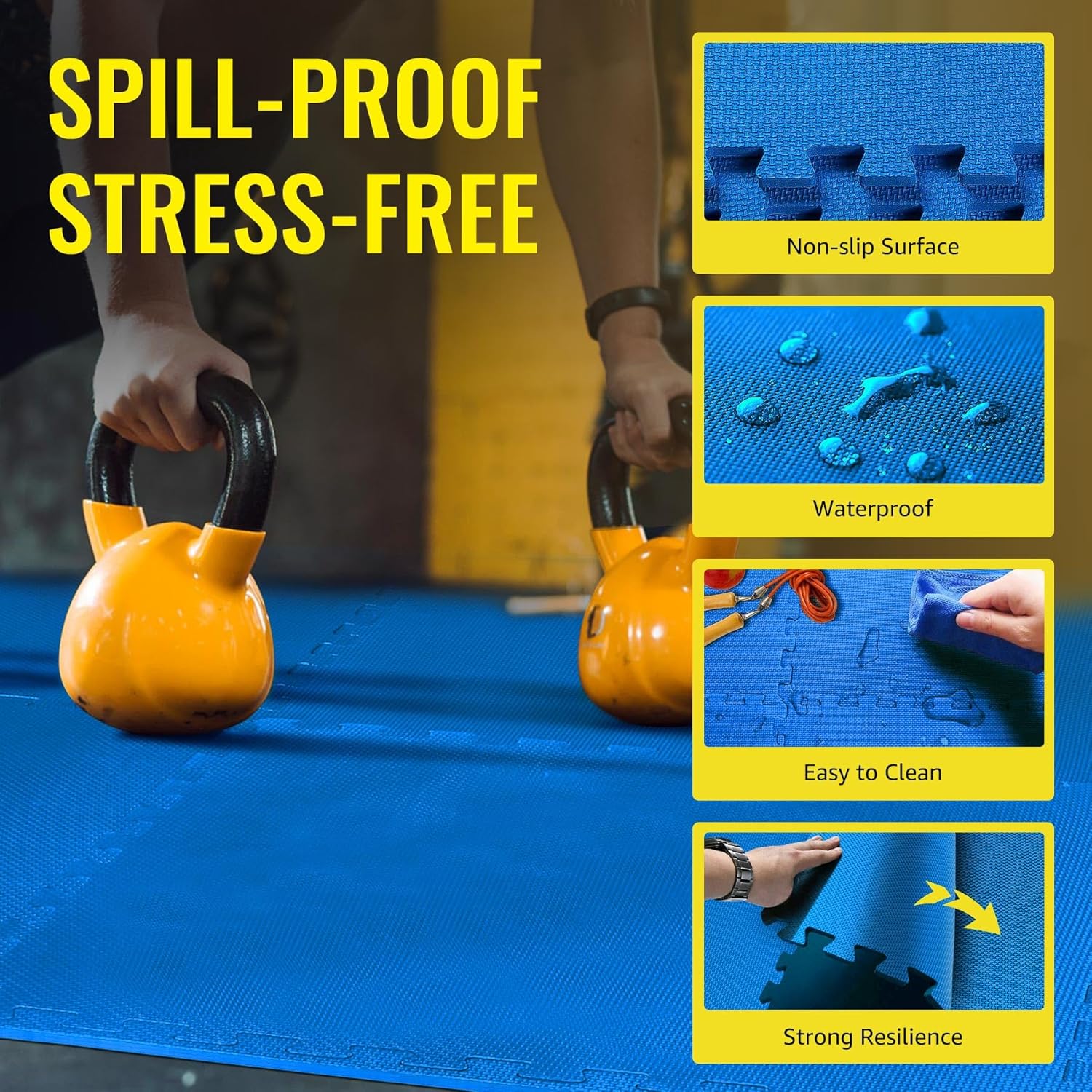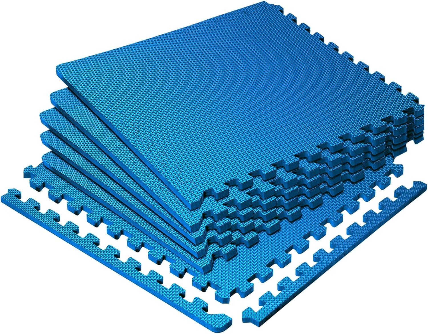 - Versatile Exercise Mats: This set includes 6 blue puzzle mats, each measuring 24in Ă— 24in Ă— 0.5in, covering a total area of 24 square feet. The floor mats have interlocking edges, allowing you to easily move or expand them as needed. Each mat comes with 2 removable borders for a cleaner, more finished look. Plus, the compact design makes it easy to store in small spaces