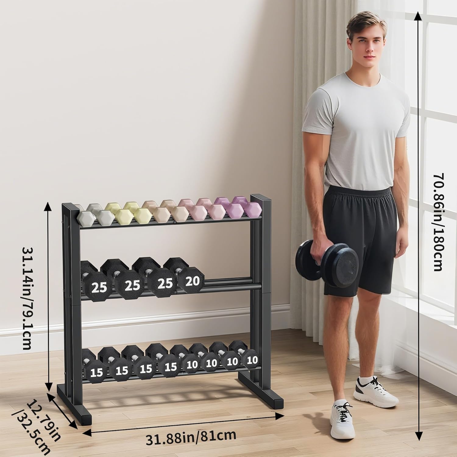 - 3-Tier High-Capacity Storage: Got too many dumbbells at home? Two tiers just not enough? Well, here's the solution – our 3-tier dumbbell stand maximizes storage space with its triple-layer design. Take action now and give those wandering dumbbells a proper home!