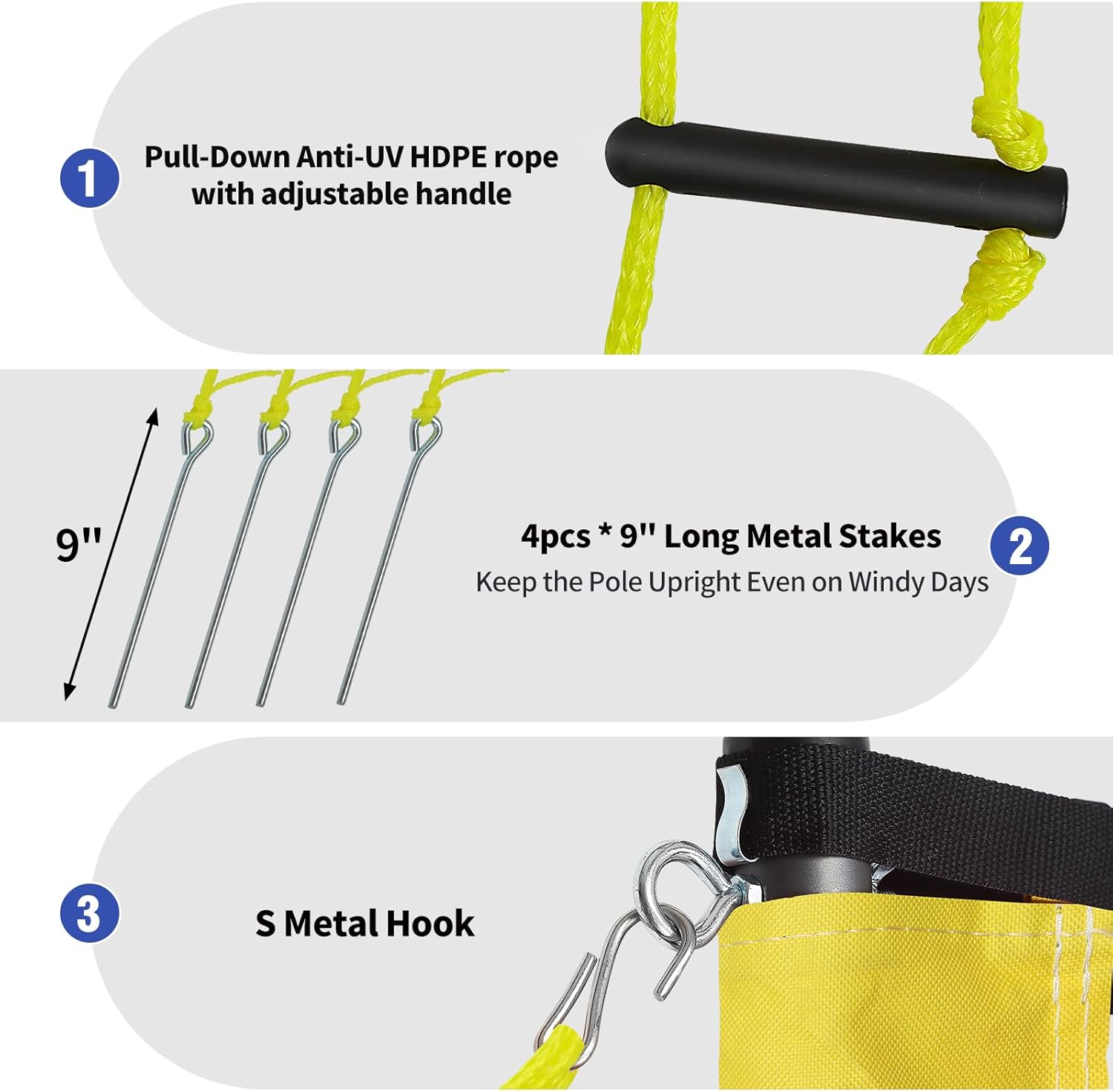 - Premium Adjusting System ! Engineered for stability, this advanced system features a pull-down anti-UV HDPE rope with an adjustable handle, allowing quick tension adjustments for optimal net tautness. Included 4pcs 9ββ metal stakes firmly into the ground, our net ensures upright positioning even in windy condition. The newly designed metal hook and spring clip can fix the adjuster and the net respectively, against sagging.