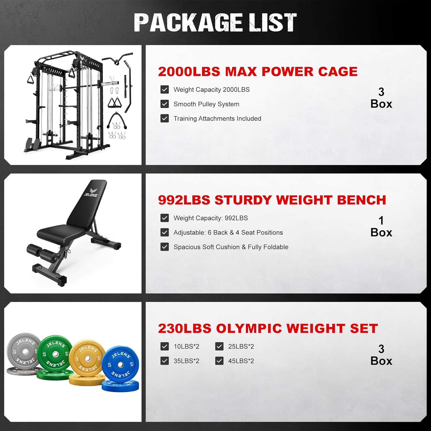 - 【Fully Equipped & Versatile】Equipped with a full set of professiona accessories, JELENS provides you with a complete and diverse home fitness experience. This includes:lat pull-down bar*1, T-bar*1, pull down bar*1, tricep rope*1, J-hooks*2, cable handle x 2, weight storage pins x 4, 360° landmine*1, foot board*1, counterweight racks with clamps*6. Meanwhile, all accessories can be quickly disassembled and installed, allowing you to switch sports modes more conveniently and quickly.