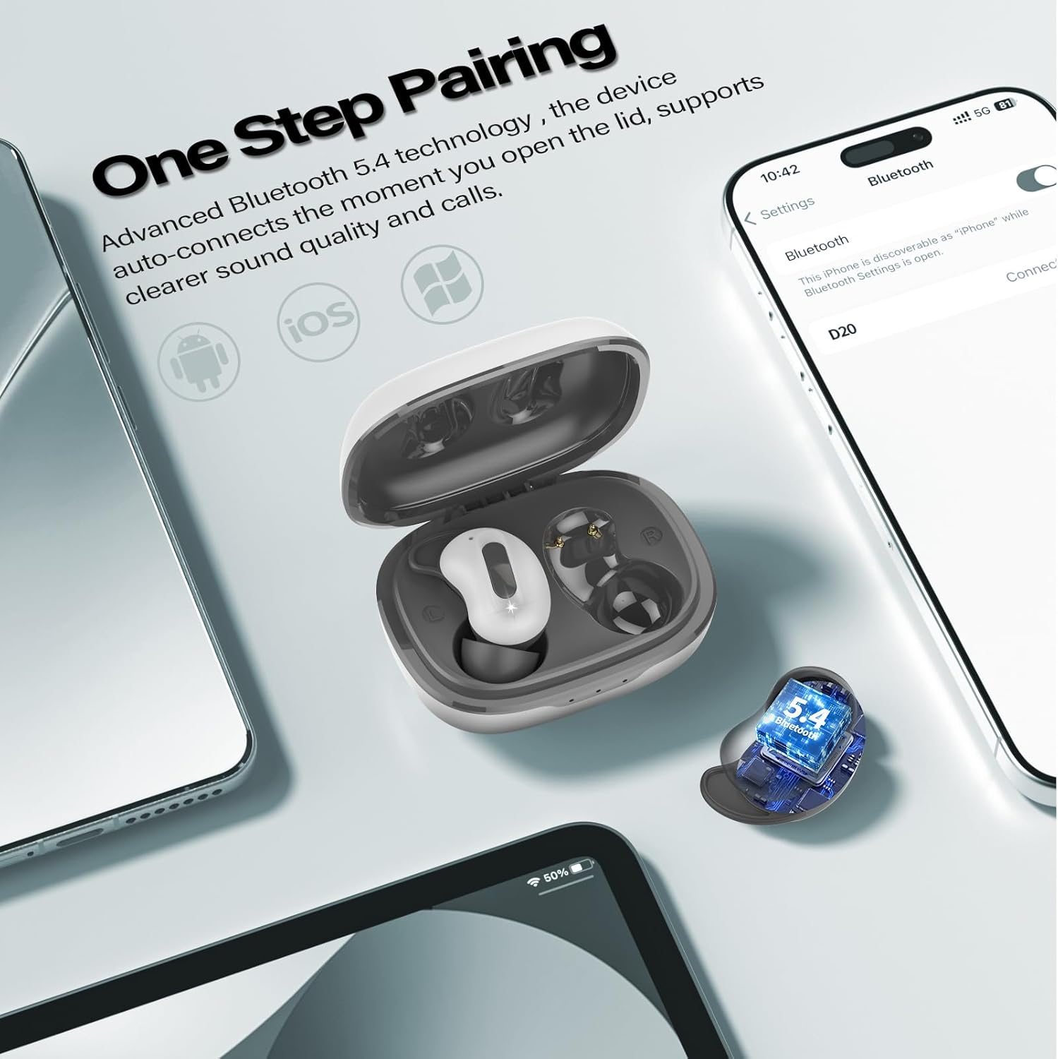 - ANC for Deep Uninterrupted Sleep: Equipped with Active Noise Cancellation (ANC), the D20 earbuds noise cancelling effectively block out snoring, noisy roommates, or street sounds. Whether you're at home, on a plane, or in a loud hotel, these earbuds create a personal "sound cocoon" for restful sleep, focused meditation, or deep relaxation—anytime, anywhere.