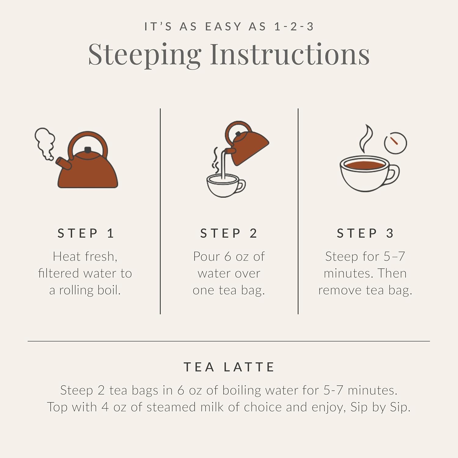- Steeping Instructions: Simply heat fresh, filtered water to a rolling boil. Then pour 6 oz of water over a tea bag and steep for 5–7 minutes. For a tea latte, double the amount of tea bags used and top with 4 oz of steamed milk of choice.