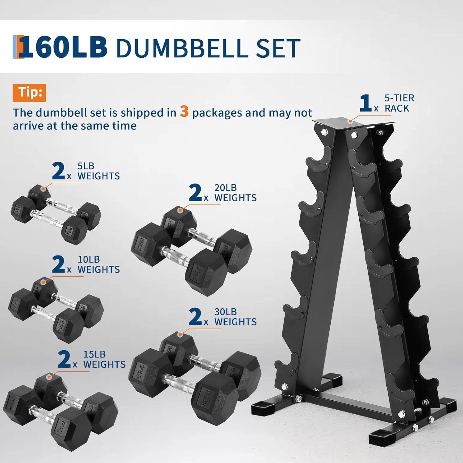 - Comprehensive 160LB Dumbbell Set: This dumbbell set includes a diverse range of weights—2x5LB, 2x10LB, 2x15LB, 2x20LB, and 2x30LB—allowing you to easily tailor your workout to your fitness level, making it ideal for both beginners and experienced athletes