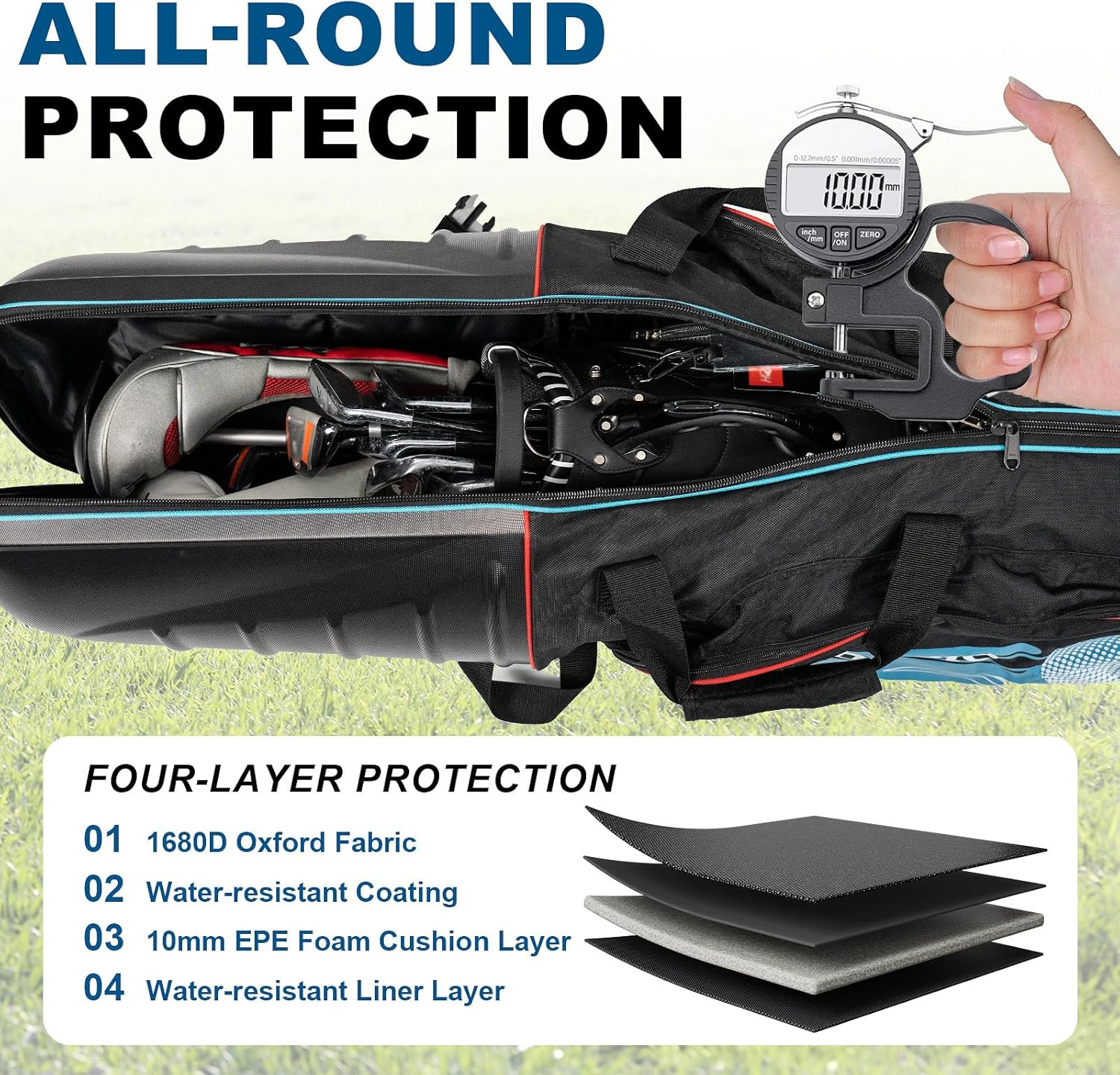 - High Quality Material: This golf travel bag is made of premium 1680D heavy-duty polyester Oxford with an ABS hard shell top; A thickened cushion layer runs through the bag, helping prevent damage to your valuable golf equipment even during long trips where bags may be handled roughly