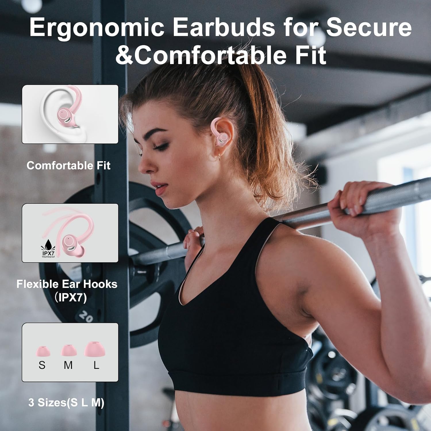- Sports Comfort and IP7 Waterproof: The wireless earbuds feature an ergonomic design that fits snugly in the ear, preventing slippage even during intense activities like running or jumping rope. With S/M/L-sized ear tips included, they adapt to various ear shapes for a comfortable fit, even during extended use. This running headphone boasts an IP7 waterproof rating, ensuring resistance to sweat and light rain, so you can enjoy your music in any condition (not suitable for swimming/showering).