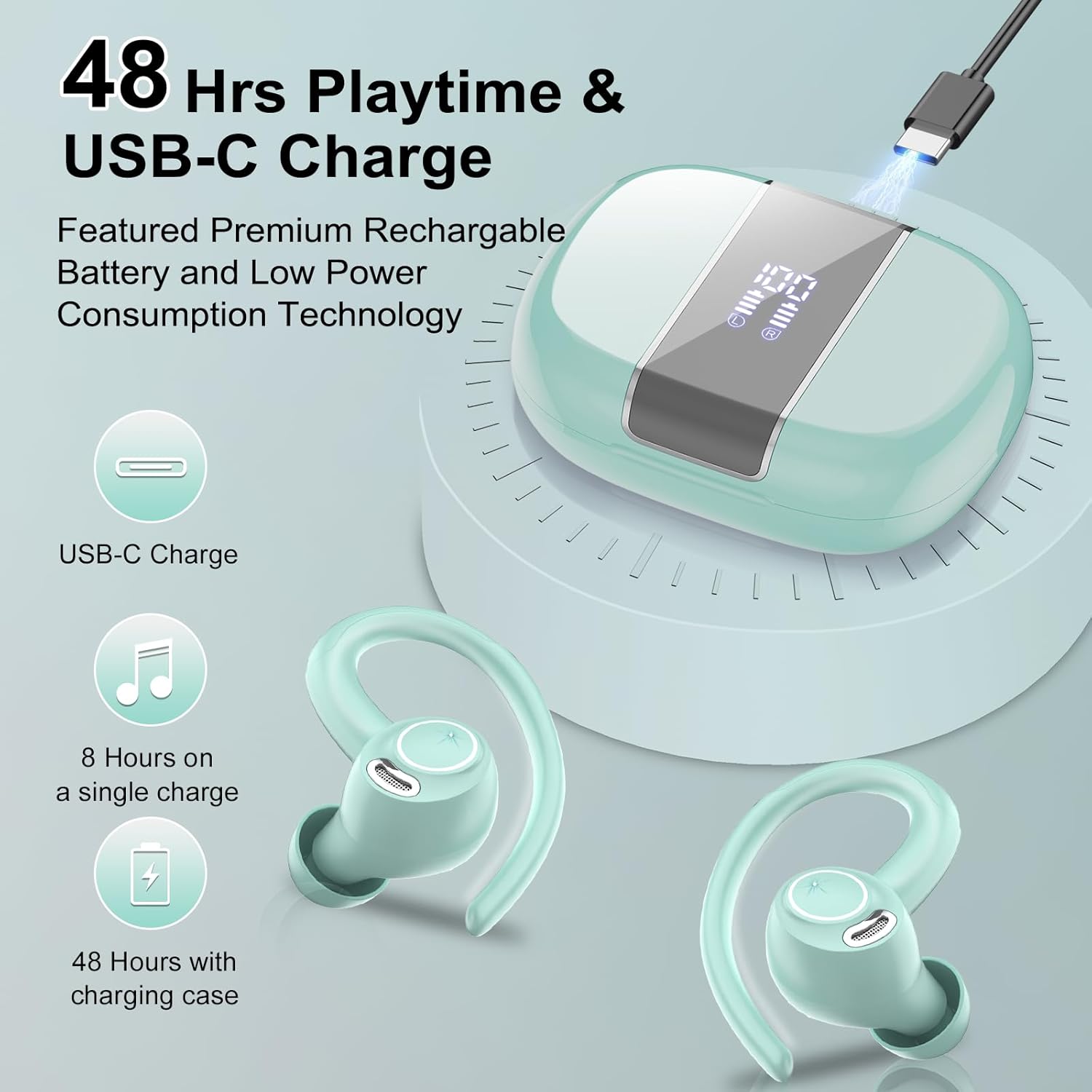 - 48Hrs Playtime and Dual LED Display: These wireless ear buds deliver up to 8 h of continuous playback on a per charge. With the high-capacity charging case providing 4-5 extra charges, enjoy a total of 48 h of extended usage to meet all-day needs. The case features an intelligent dual LED display that accurately shows remaining battery levels for better power management. Supporting USB-C fast charging, it achieves full recharge in just 1.5 h, significantly enhancing convenience and efficiency.