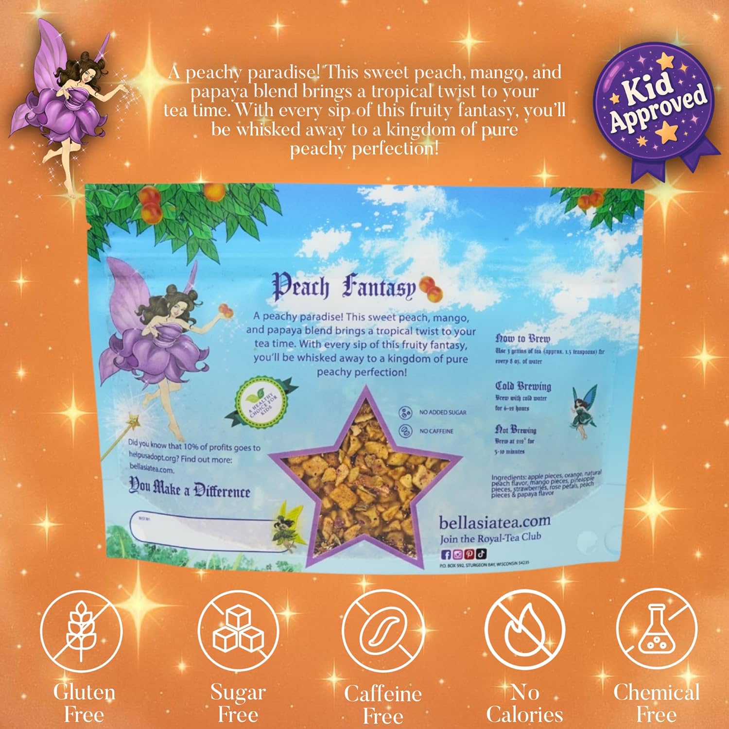 - Fun Daily Ritual: Introduce a delightful tea moment into your child's daily routine with a balanced and fruity cup of caffeine-free tea. Crafted using real peach fruit pieces, this blend is naturally sweet and ideal for warm or iced enjoyment. It’s a great choice for kids who enjoy variety through tea bags. Whether for snack time or story hour, our loose-leaf tea brings fun to every sip.