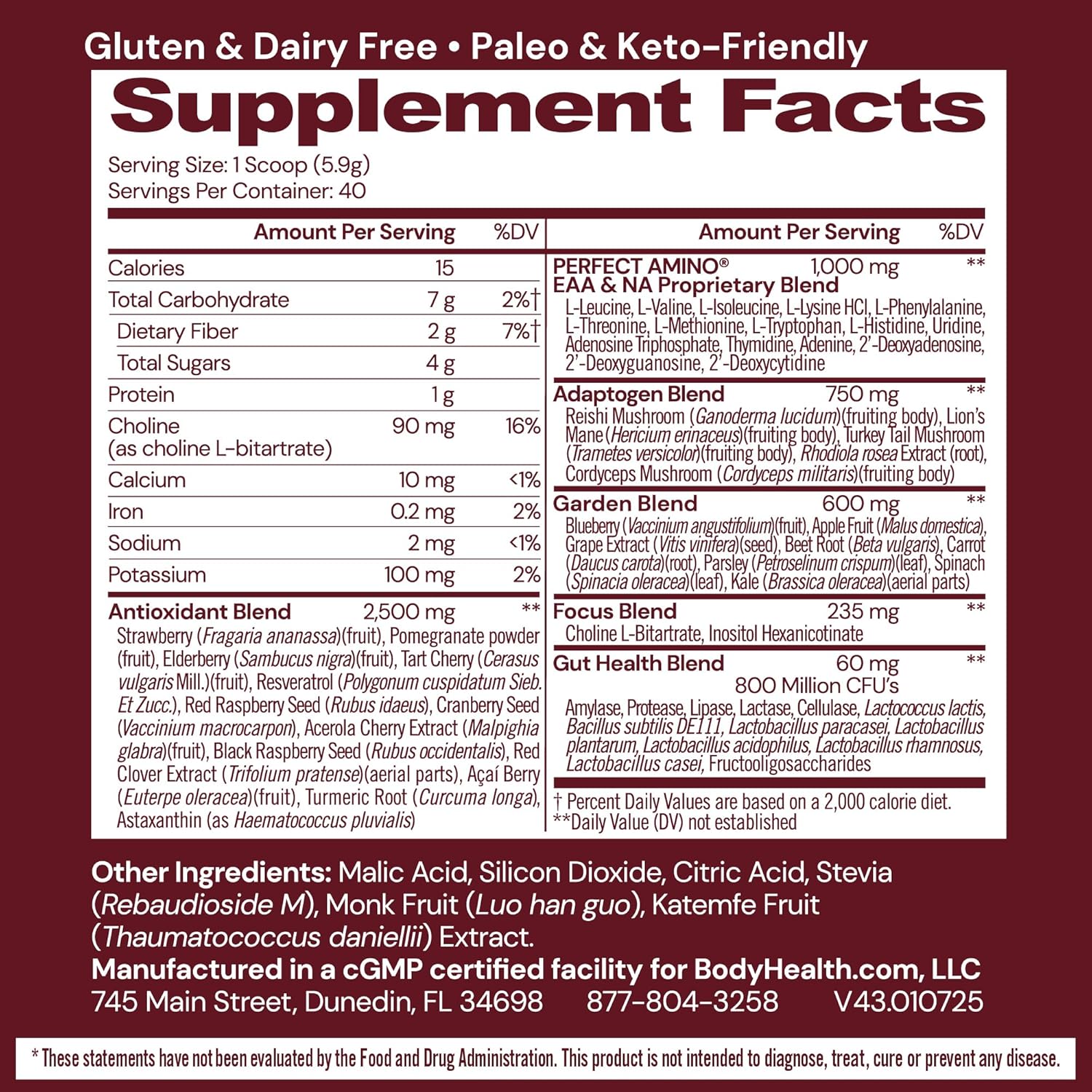 BodyHealth Reds Enhanced with PerfectAmino - Daily Superfood Smoothie Powder with Antioxidants, Adaptogens, Phytonutrients, Fruit, Prebiotics, Probiotics, Fiber, and Protein - 40 Servings