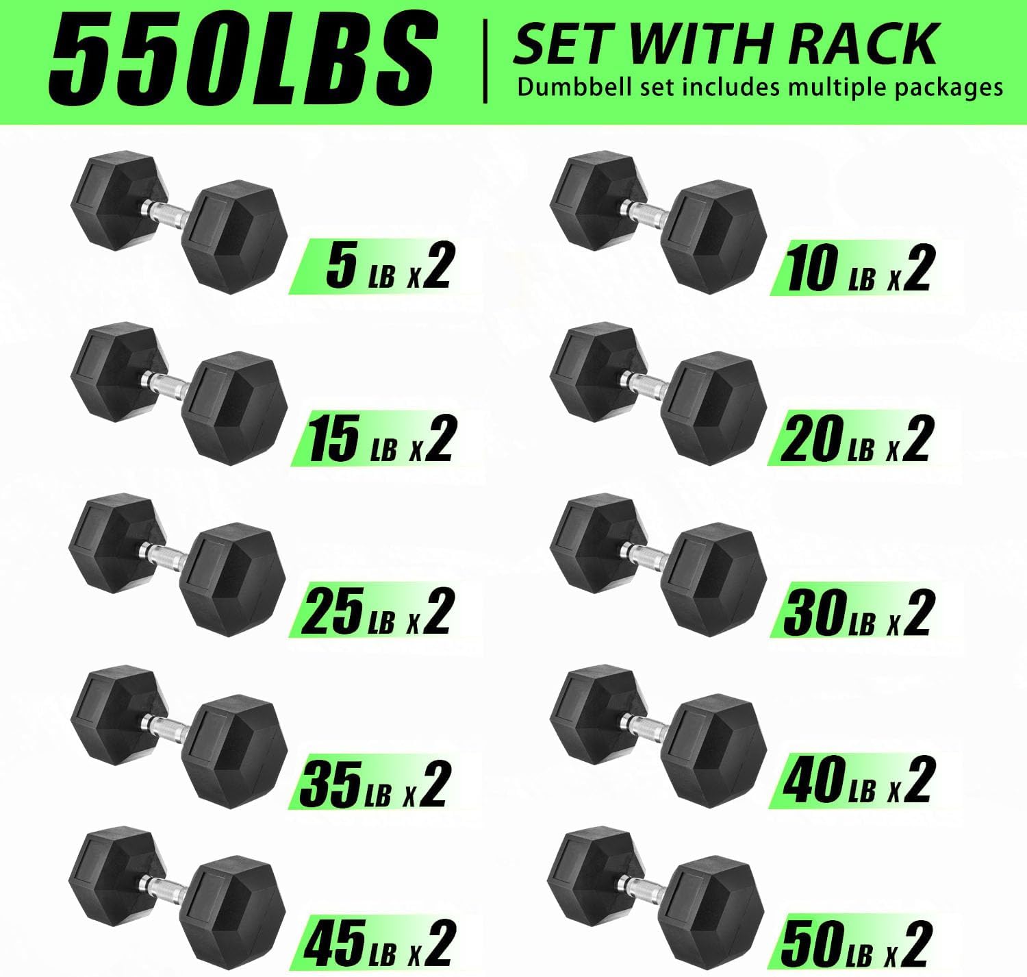 350/450/550 lbs Hex Weight Dumbbells Sets with Rack Rubber Encased Dumbbell Free Weights Set for Home Gym Weight Rack with Dumbbells Set