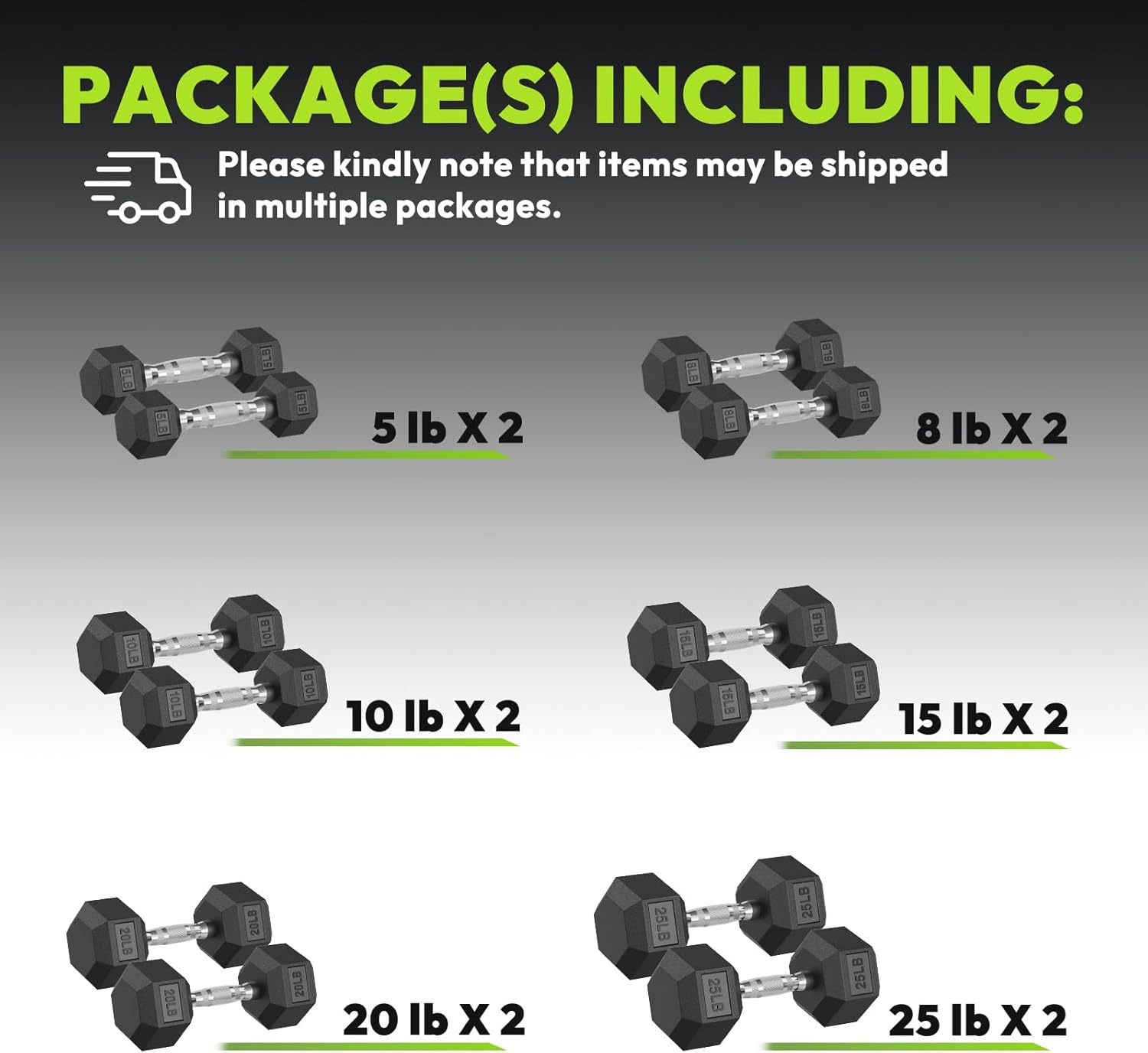 - Premium Rubber Encasement: Include a pair of ( 5 lb 8 lb 10 lb 15 lb 20 lb 25 lb ) hex dumbbell weight made from solid cast iron cores and virgin rubber coating, these dumbbells resist cracking and fading while protecting both your floors and equipment. The durable rubber shell absorbs impact for quieter workouts.