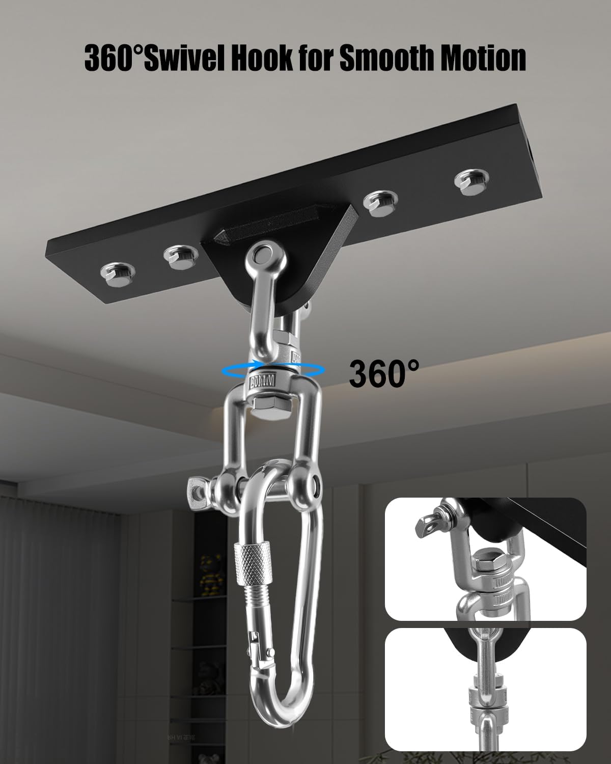 - 360° Swivel Hook: Equipped with a 360-degree swivel, the mount allows your bag, swing, or hammock to rotate freely without twisting the straps. Enjoy fluid movement—without friction or interruption