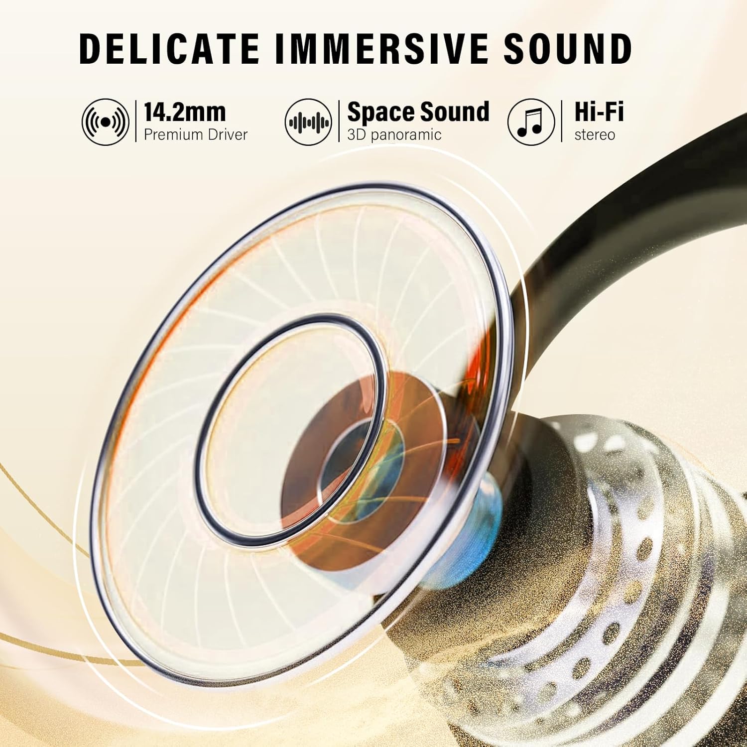 - Advanced Bluetooth 5.4: The over the ear earbuds uses the new generation of Bluetooth 5.4 technology to connect up to 15 meters. After the first pairing, simply remove the headset to connect immediately. Provides faster and more stable performance, allowing you to enjoy your music with zero latency and without interruption.