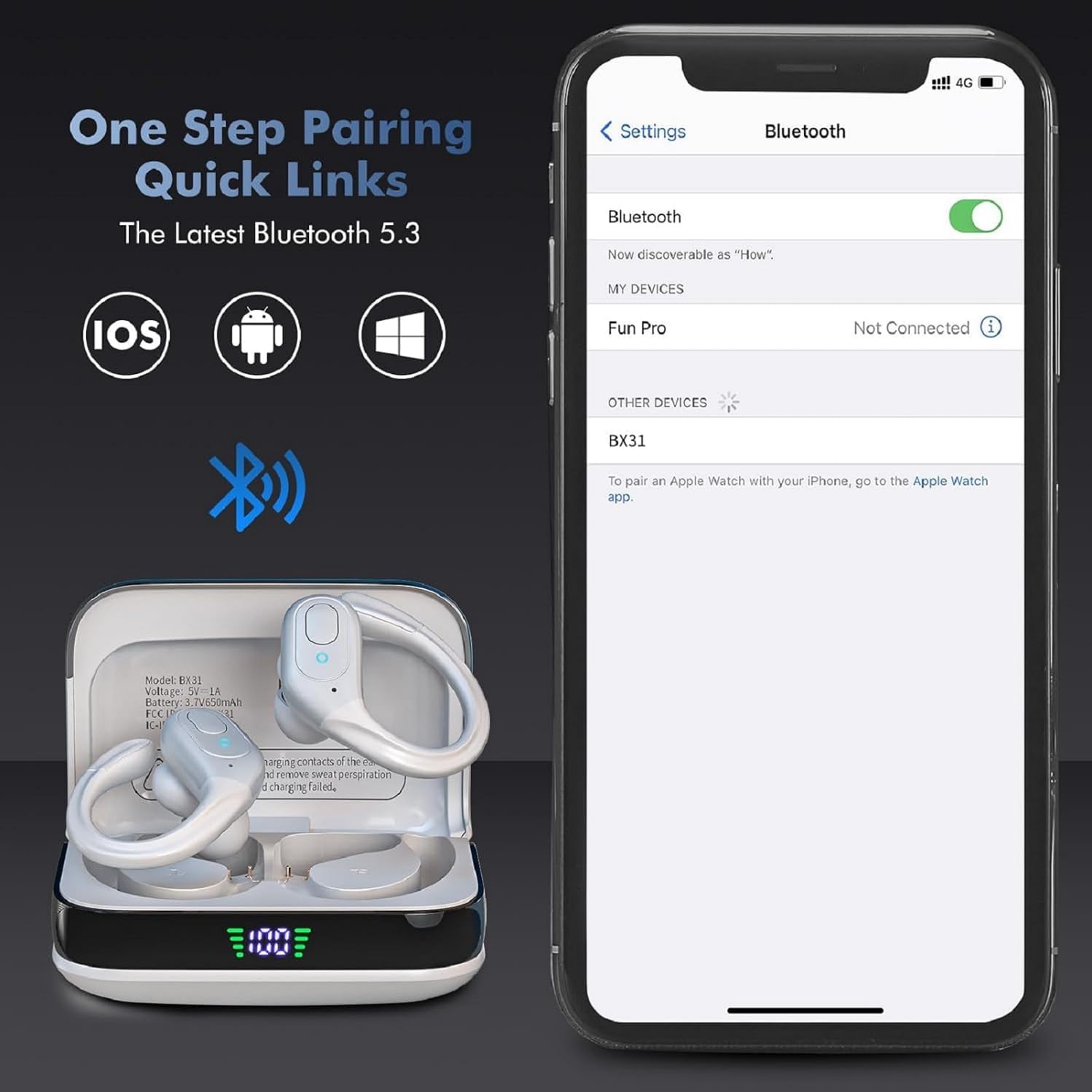 Bluetooth Headphones Wireless Earbuds with 75Hrs Playback, LED Display Charging Case, IPX7 Waterproof, Over-Ear Design Ear Buds for Sports/Running/Workout - White