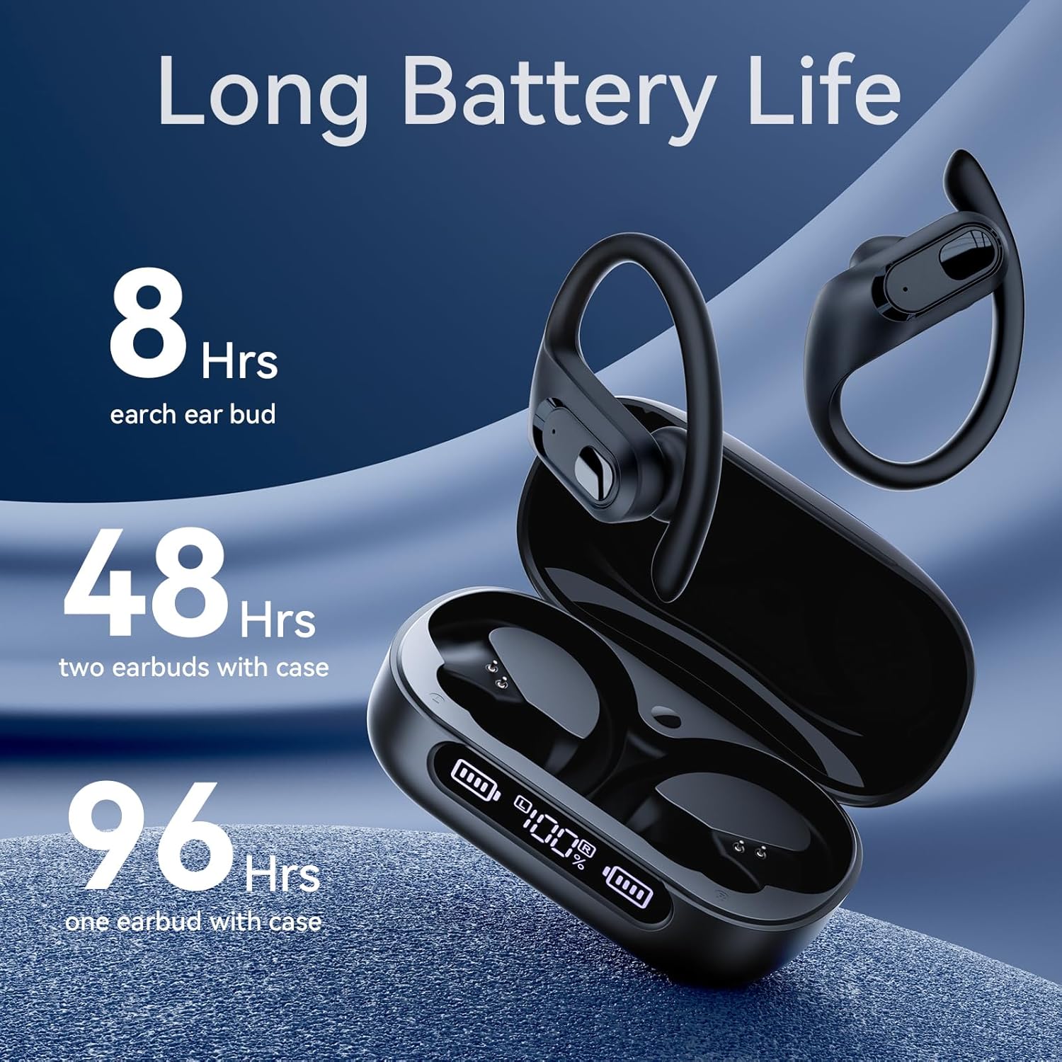 - Dual LED Display and 96Hours Playback: Sport earbuds provides up to 8 hours continuous using time per charge, portable charging case can charge the earbuds for 5-6 times, giving 48 hours of a total playback in single ear mode or 96 hours in dual ear mode. Whether on the road or in daily life, it will provide unparalleled convenience and smart experience. The dual LED display on earbuds accurately display the remaining power of charging case and the charging progress of Wireless earbuds