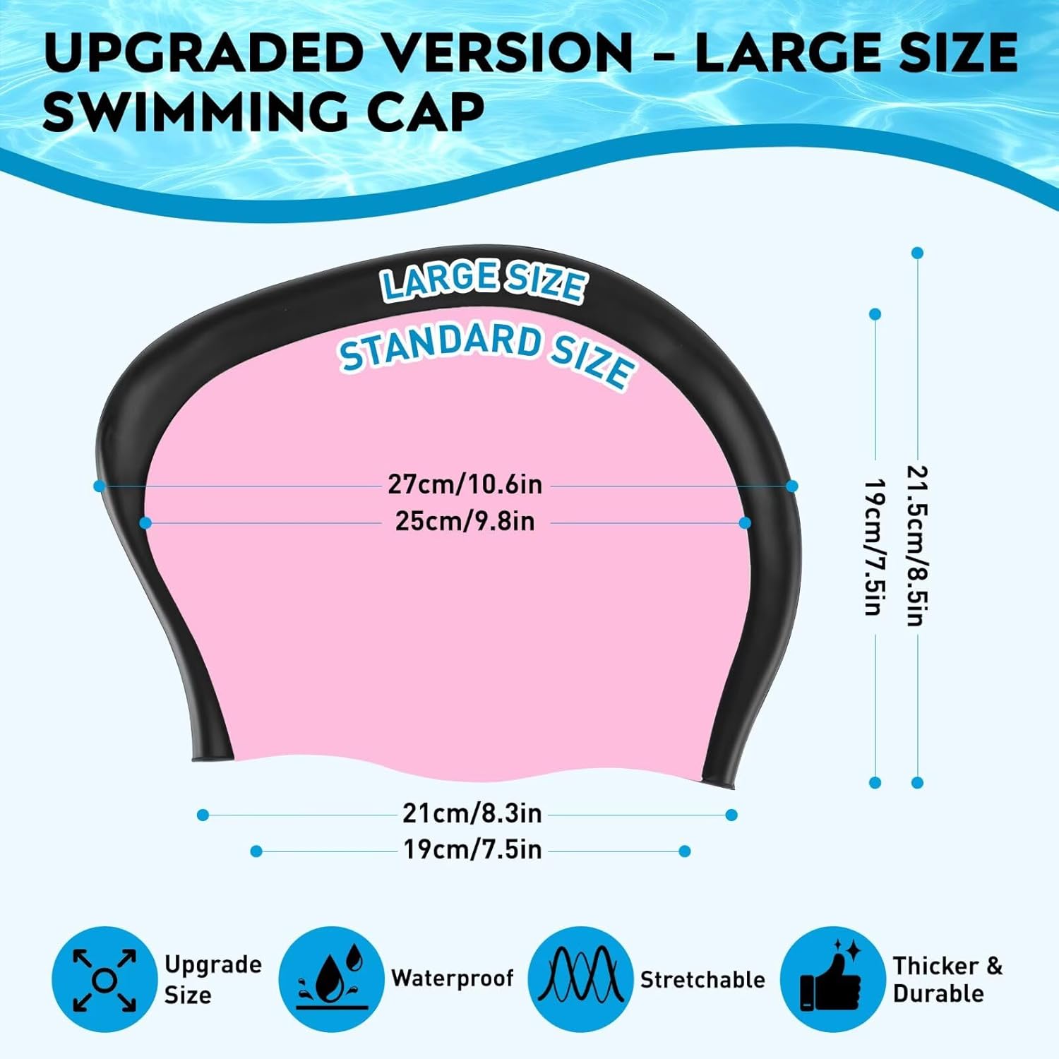 2 Pack Large Swim Caps for Long Hair, Silicone Swimming Cap for Adult Women Men, Waterproof Swim Hats Bathing Caps to Keep Hair Dry with Bonus Nose Clip and Earplugs
