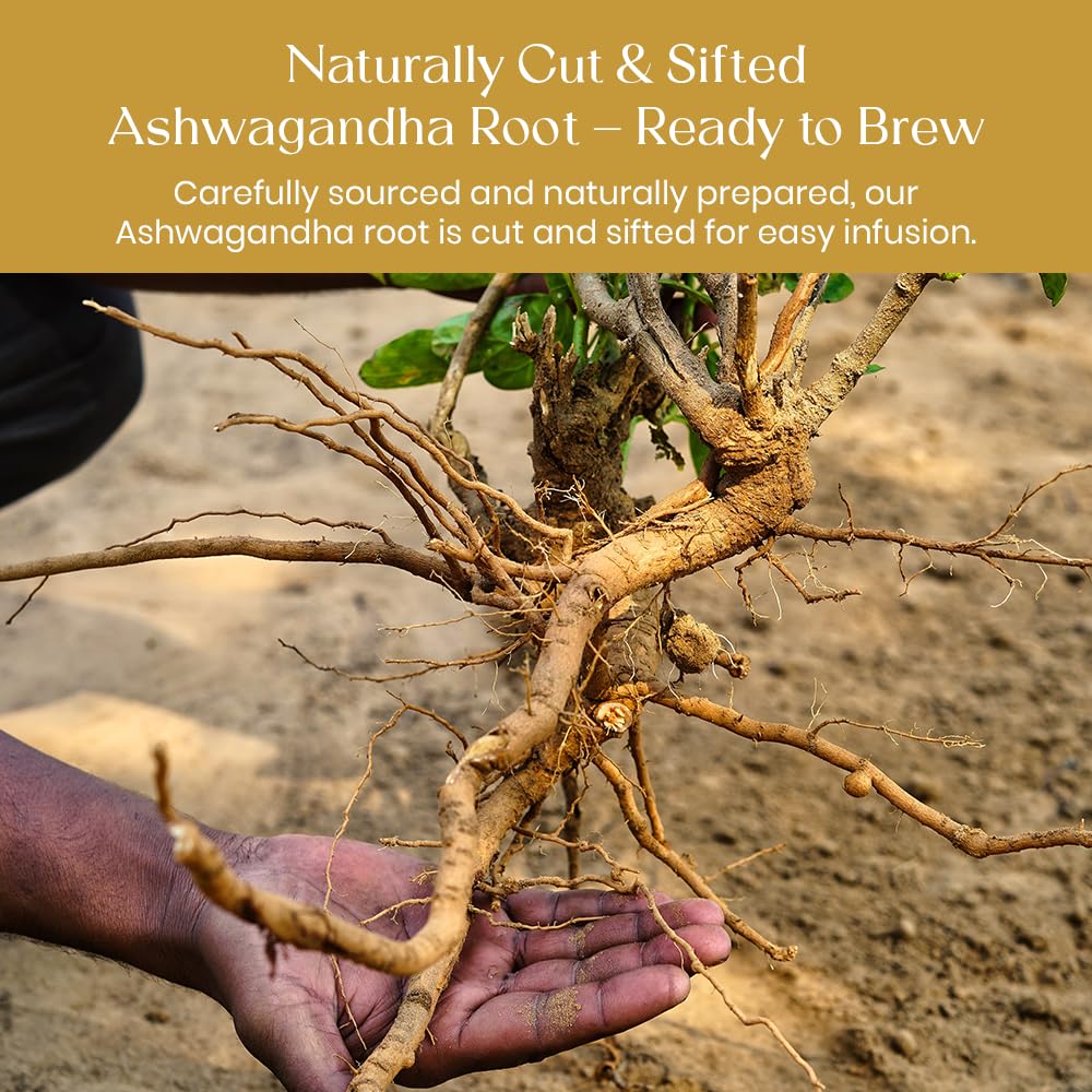 - Born from the Earth Sustainably cultivated in the sun-rich soils of India ( Madhya Pradesh) , our ashwagandha roots are hand-dug, gently sun-dried, and left whole to preserve their integrity. In this cup lies the unbroken spirit of the root — deep, wise, and unwavering.