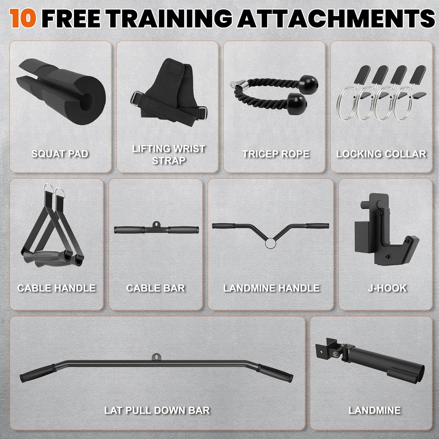 - All-in-One Training System: Equipped with a dual cable crossover system, multi-grip pull-up bar, and landmine attachment, this rack supports over 80 full-body exercises, including squats, bench presses, lat pulldowns, rows, bicep curls, and more. Whether for strength training, bodybuilding, or functional workouts, P67 covers it all.