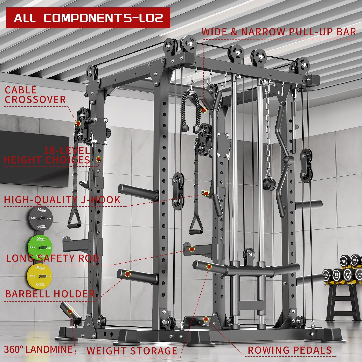 - 【Sturdy and Durable Home Fitness Station】The home fitness system is made of heavy-duty steel frame, which ensures structural stability and durability. With a footprint of 42.7 “L x 59.8 ‘W x 83.4 ’H, L02, and a total bare machine weight of 590 lbs, it can withstand up to 1,800 lbs of weight during training with great stability.