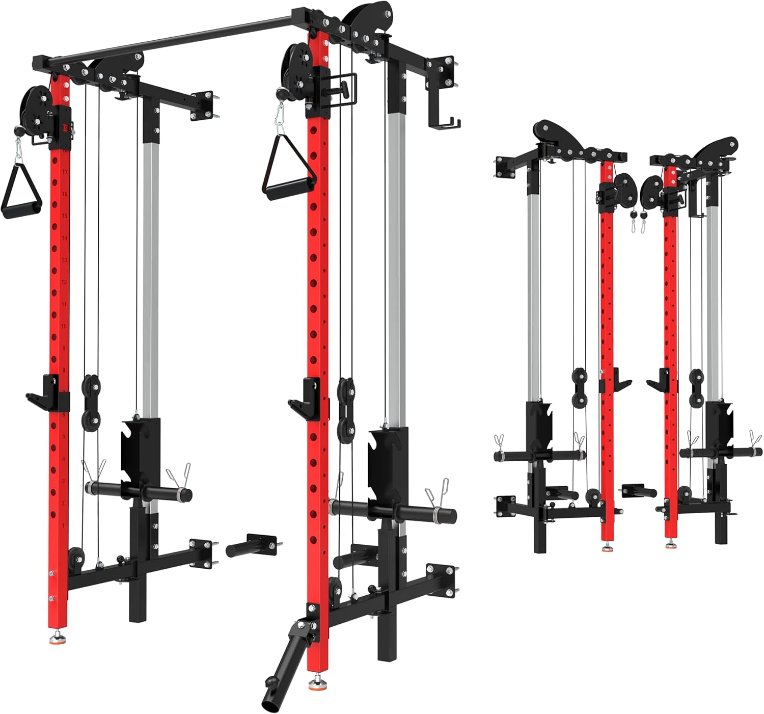 - 【Full Body Workout】This squat rack for home gym is equipped with 19 levels of adjustable pulley height, detachable pull-up bar and high-quality quick-change accessories (J-hook, safety arm, landmine tube) to maximize the effect of each training. With more than 80 different full body exercises, including squats, bench press, seated row, pull-up fly, bicep curl, back kick, etc., it is the perfect choice for fitness enthusiasts who are looking for a comprehensive exercise experience.