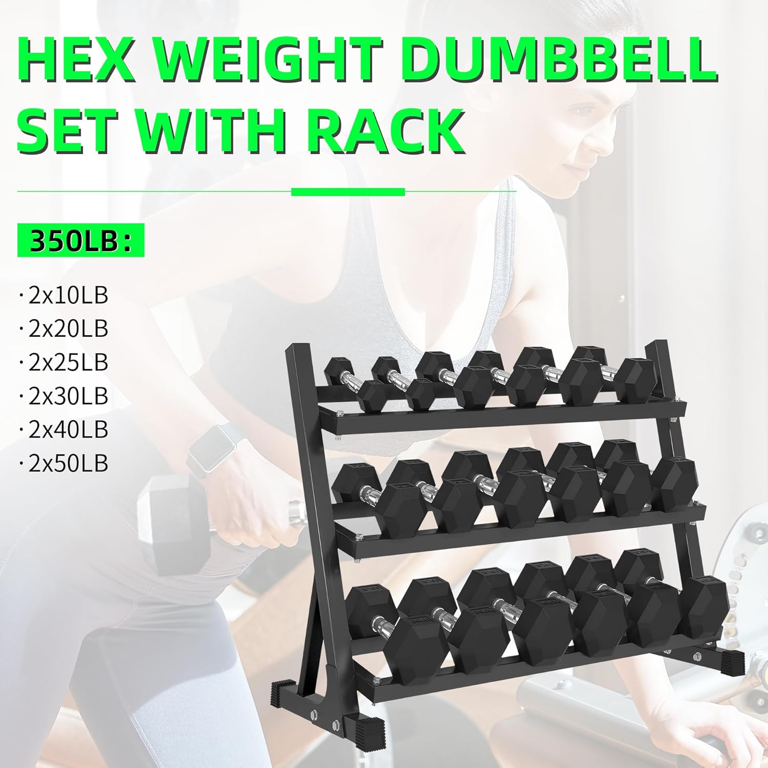 - Versatile Weight Dumbbell Sets: This 350lbs dumbbell set – a rubber hex dumbbells set with a home dumbbell rack – comes with a range of weights from 10LB, 20LB, 25LB, 30LB, 40LB, 50LB (including 10/50 dumbbell rack compatibility) and even a 10-50 barbell dumbbell rack-heavy duty adjustable 3 tier dumbbell storage rack. This rack of dumbbells includes 6 pairs, making it suitable for teenagers, adults, and women in gyms or home setups. The different specifications provide the right free weight for different fitness levels and exercises, whether you’re using the dumbbell hex set for strength training or pairing it with a dumbbell and kettlebell set for versatilit