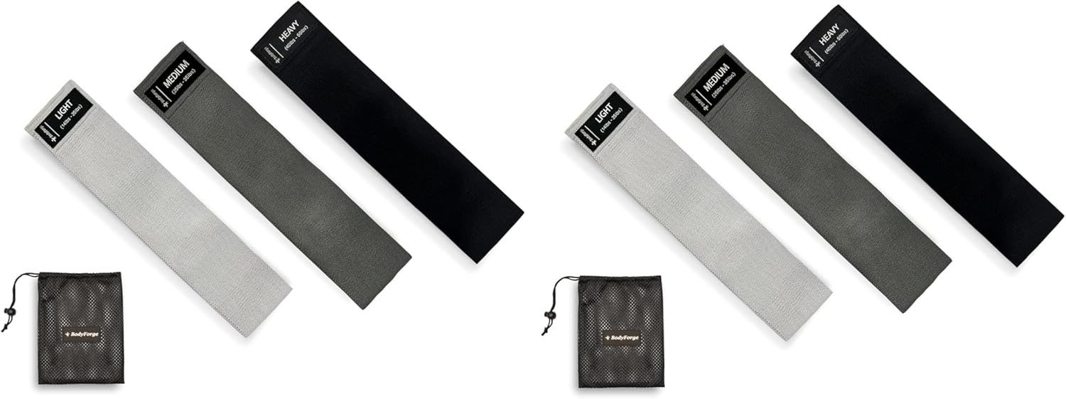 - PREMIUM EXERCISE BANDS: BodyForge Fabric Hip resistance bands come in 3 varying resistance levels (Light 14-25lbs, Medium 25lbs -35lbs, Heavy 40lbs-50lbs). Made with a soft cotton material, these wide bands offer comfort while preventing pinching and snapping. The built in latex grip prevent the band from slipping or rolling while exercising. The 14β³ by 3β³ bands offer a great variety of exercise options whether you are just beginning your workout journey or been working out for years.