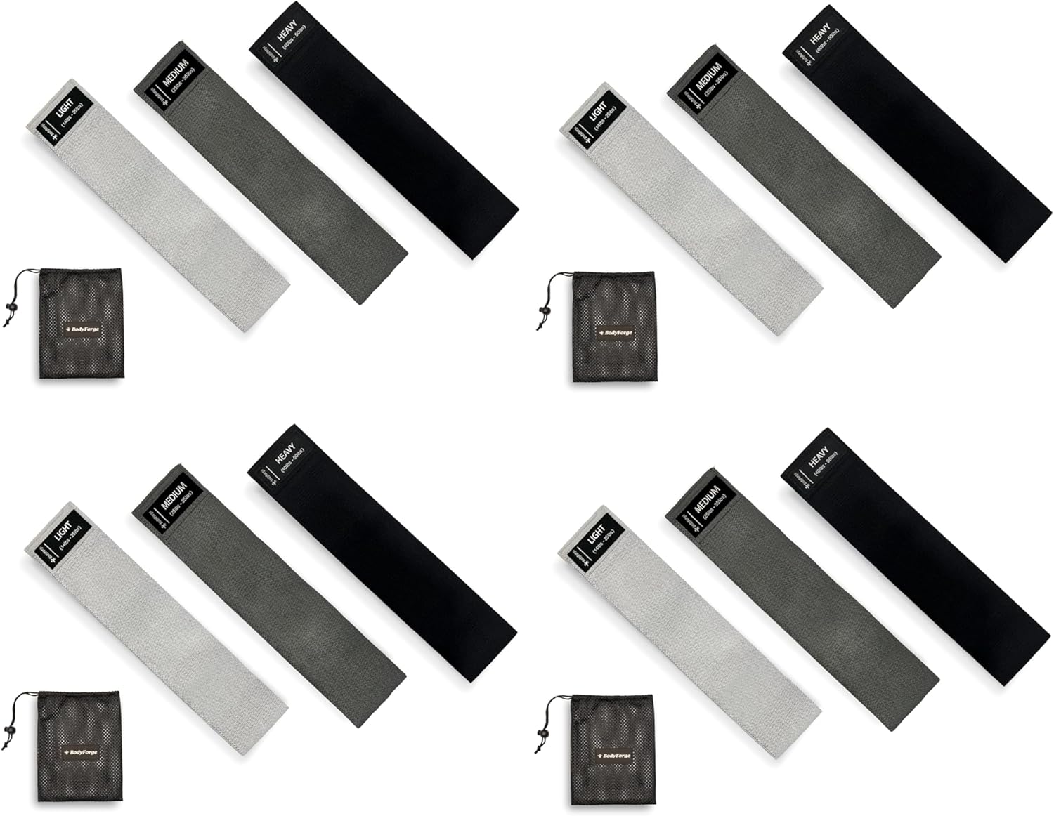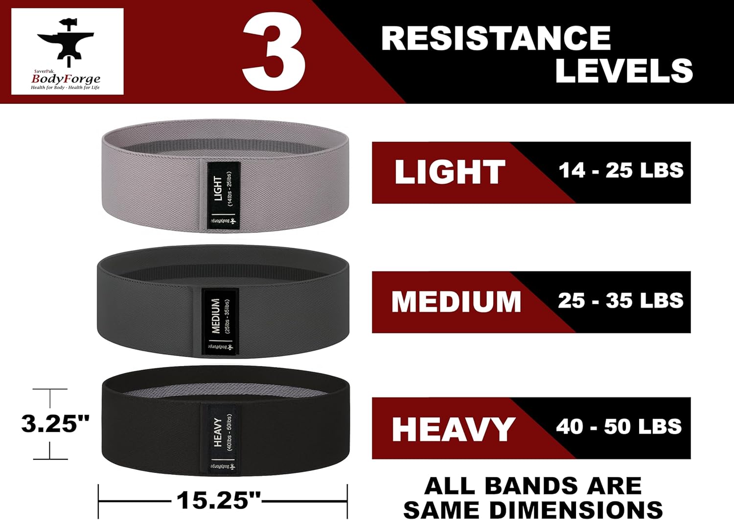 - PREMIUM EXERCISE BANDS: BodyForge Fabric Hip resistance bands come in 3 varying resistance levels (Light 14-25lbs, Medium 25lbs -35lbs, Heavy 40lbs-50lbs). Made with a soft cotton material, these wide bands offer comfort while preventing pinching and snapping. The built in latex grip prevent the band from slipping or rolling while exercising. The 14β³ by 3β³ bands offer a great variety of exercise options whether you are just beginning your workout journey or been working out for years.
