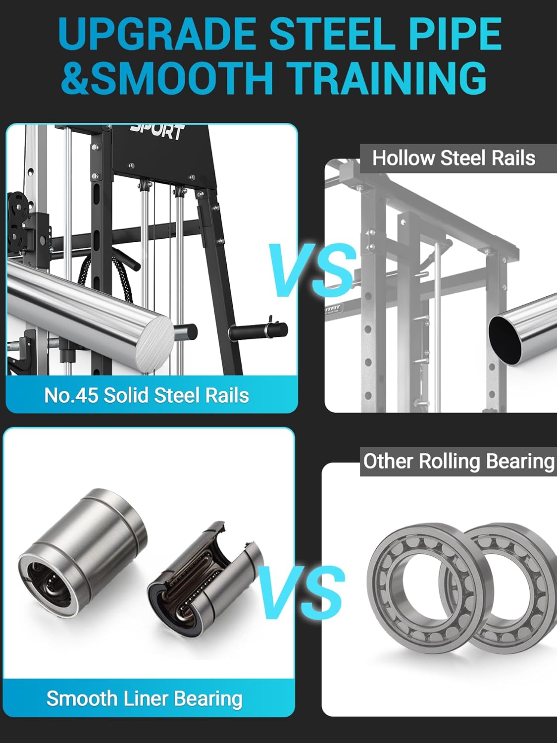 - 【All in One Smith Machine】 – This multifunctional smith machine combines a power cage, squat rack, cable crossover machine, and pull-up station. Perfect for a full-body home gym workout station in one compact design.