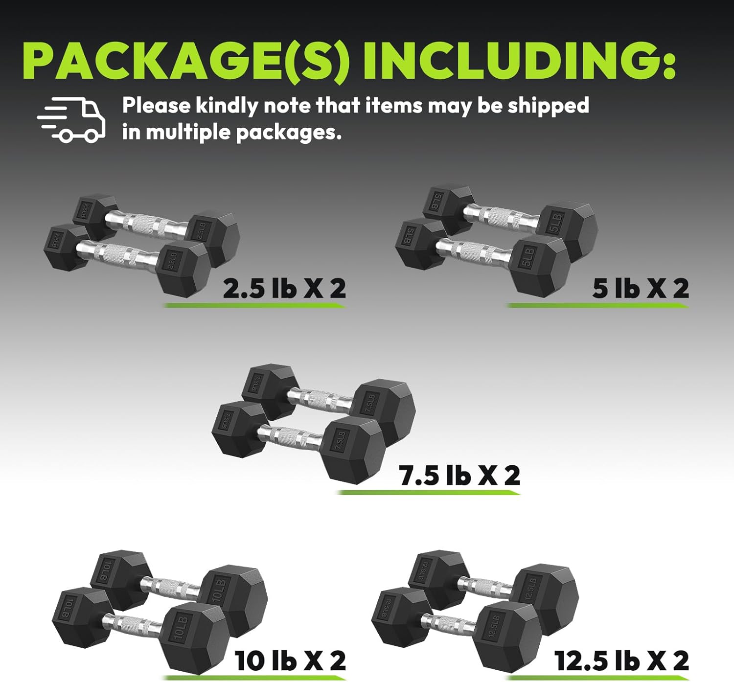 - A pair of (2.5 lb, 5 lb, 7.5 lb, 10 lb, 12.5 lb) hex dumbbell weight for workout and muscle training.
