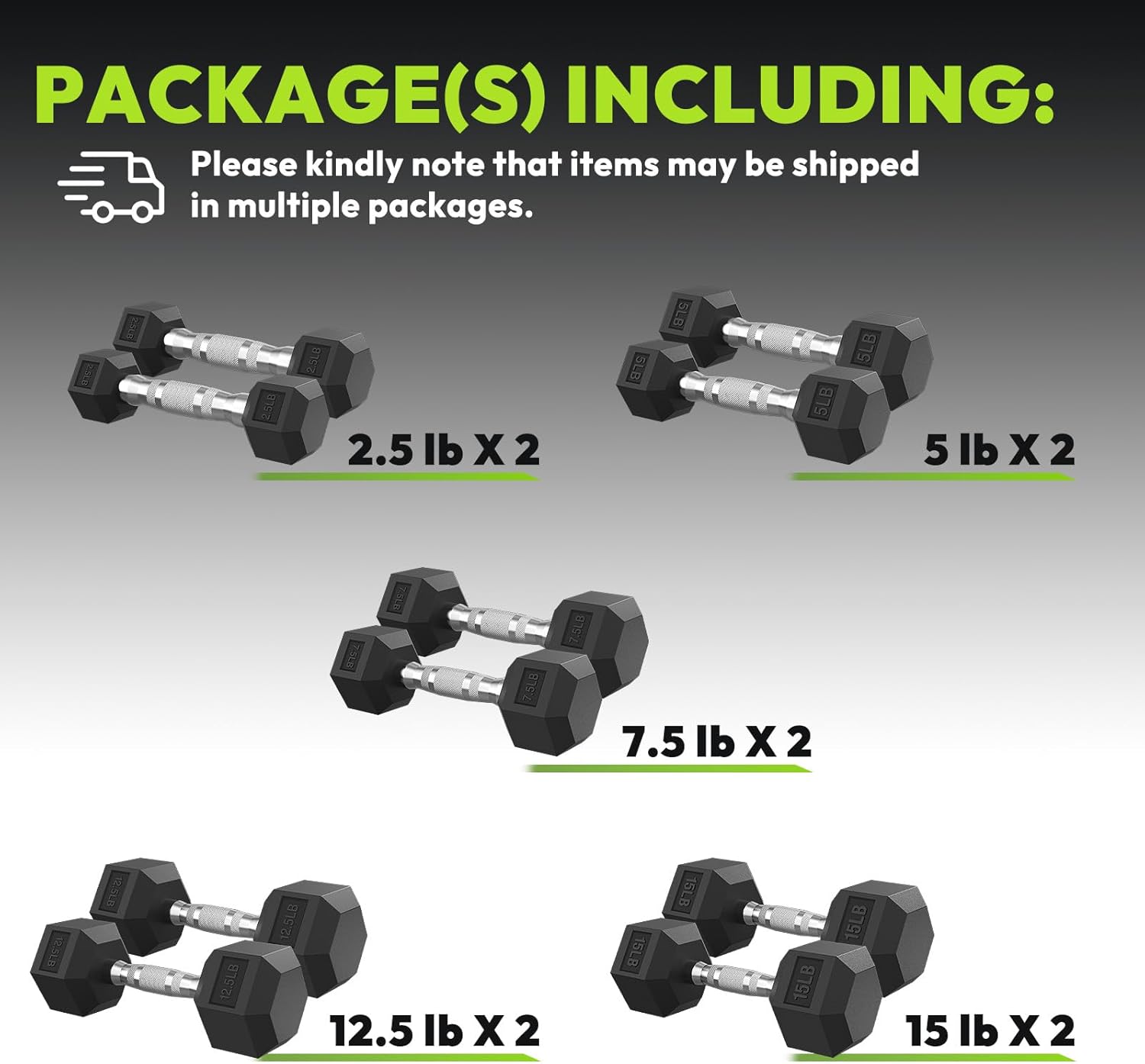 - A pair of (2.5 lb, 5 lb, 7.5 lb, 12.5 lb, 15 lb) hex dumbbell weight for workout and muscle training.