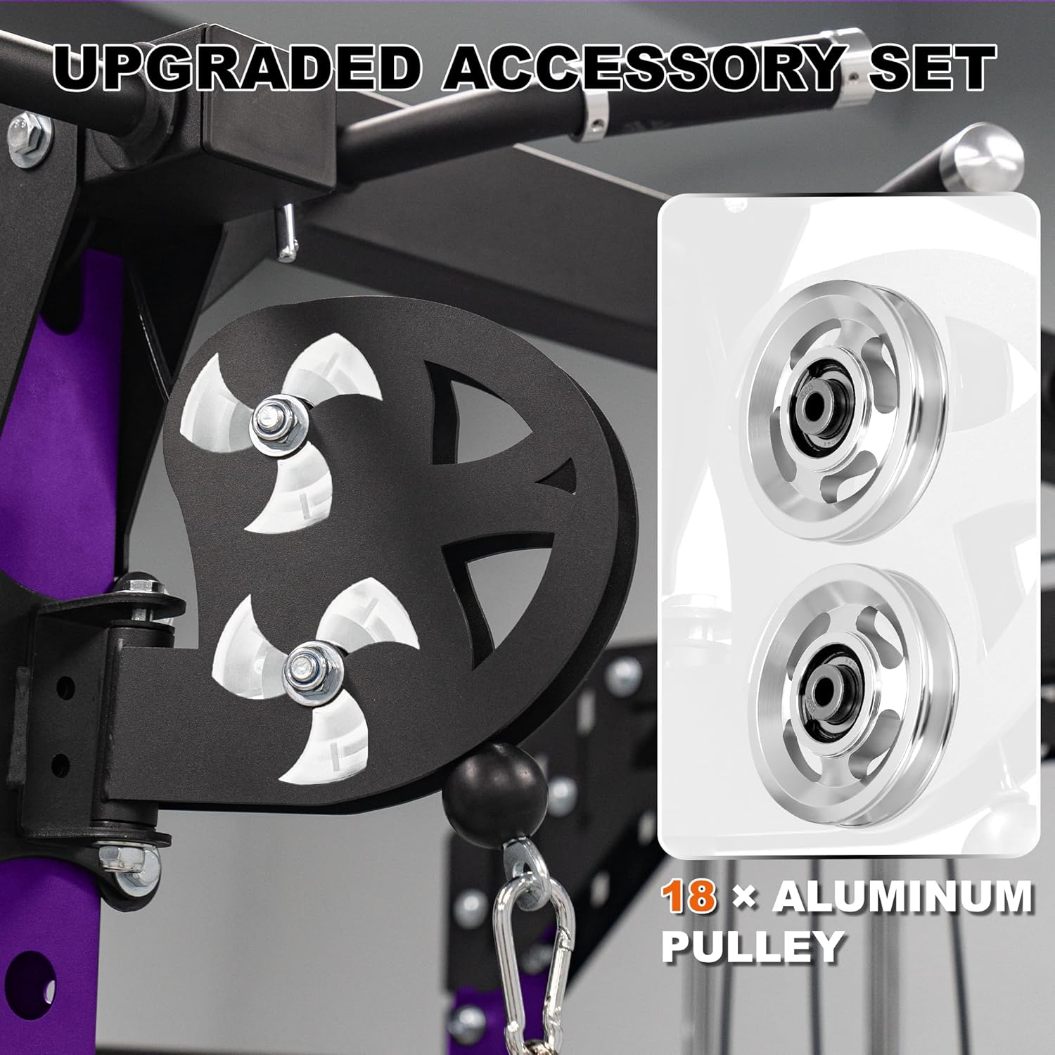 - 7-in-1 Functional Trainer Transition: Seamlessly between Smith rack exercises, high-low cable pulley workouts, T-bar rows, landmine rotations, weighted dips, multi-grip pull-ups, and band resistance training—all without re-racking weights. Targets every muscle group from chest flys to deadlifts. And all weight holders, including those on the cable crossover system, support both 1" and 2" weight plates.