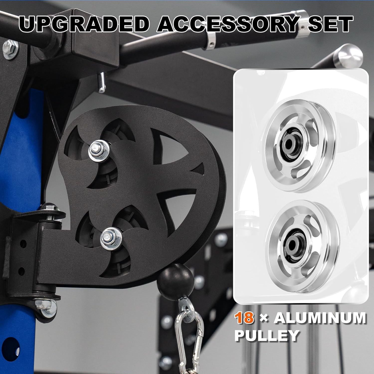 - Complete Strength Package: Includes 18 professional attachments: Multi-grip, 2 Sandwich j-cup, dip bars, safety bar, 2 handles, lat pulldown pedal, 360° landmine, 2 Olympic barbell holders, 4-post plate storage, dual cable bars, landmine pivot, lat bar, cable bar, T bar, 6 band pegs, clip, tricep rope, squat pad and lifting grips.