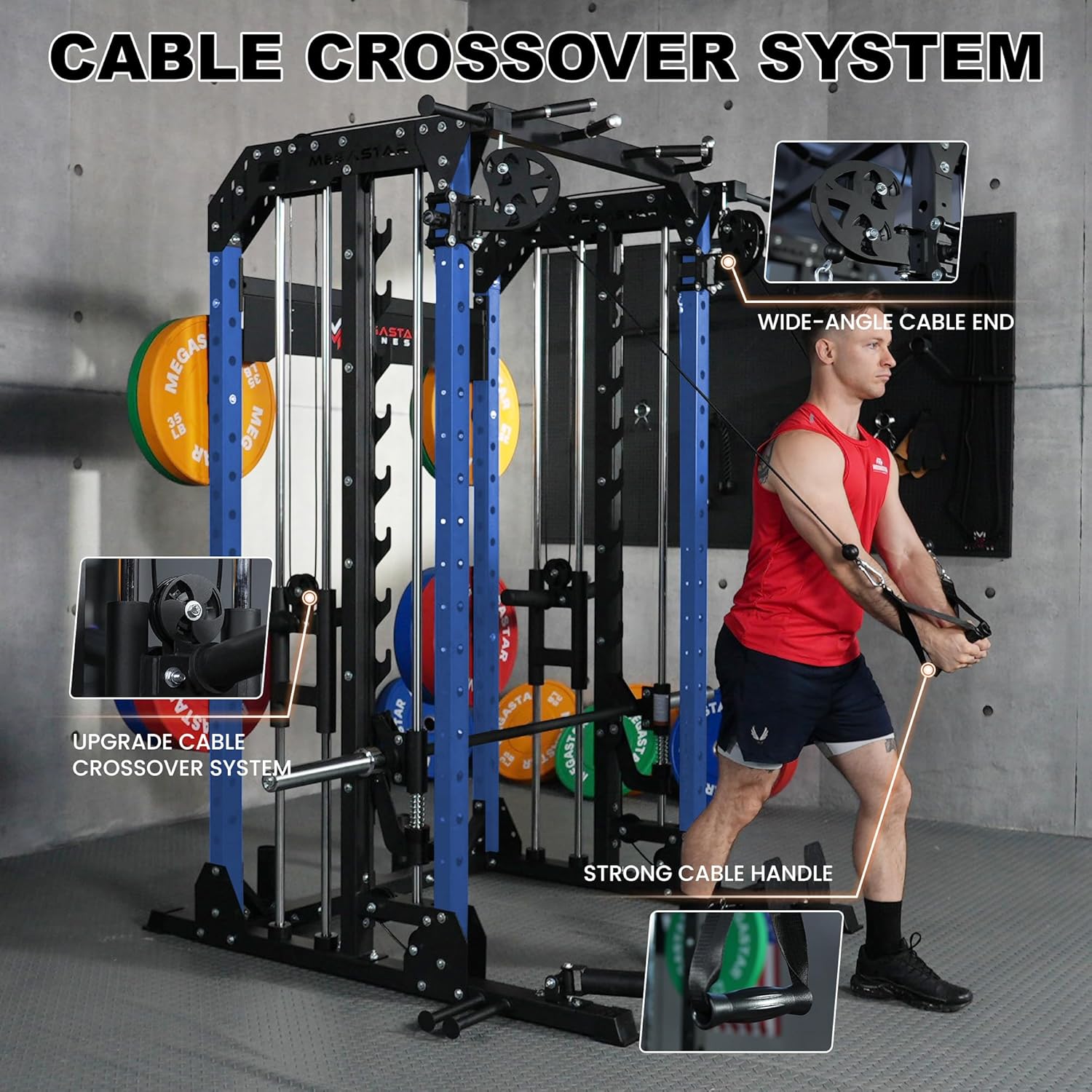 - 7-in-1 Functional Trainer Transition: Seamlessly between Power rack exercises, high-low cable pulley workouts, T-bar rows, landmine rotations, weighted dips, multi-grip pull-ups, and band resistance training—all without re-racking weights. Targets every muscle group from chest flys to deadlifts. And all weight holders, including those on the cable crossover system, support both 1" and 2" weight plates.