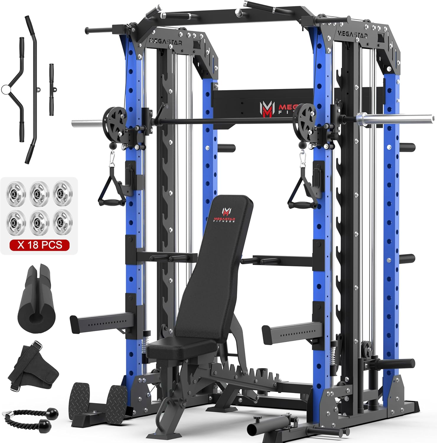 - 7-in-1 Functional Trainer Transition: Seamlessly between Smith rack exercises, high-low cable pulley workouts, T-bar rows, landmine rotations, weighted dips, multi-grip pull-ups, and band resistance training—all without re-racking weights. Targets every muscle group from chest flys to deadlifts. And all weight holders, including those on the cable crossover system, support both 1" and 2" weight plates.